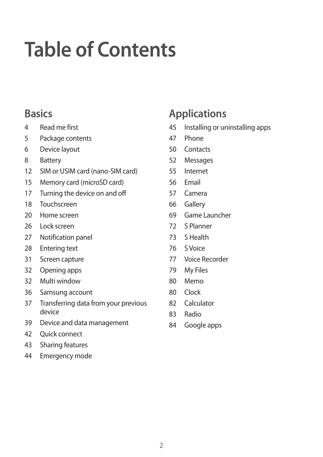 Read me first Package contents Device layout Battery SIM or USIM card (nano-SIM card) Memory card (microSD card) Turning the device on and off Touchscreen Home screen Lock screen Notification panel Entering text Screen capture Opening apps Multi window Samsung account Transferring data from your previous device Device and data management Quick connect Sharing features Emergency mode
