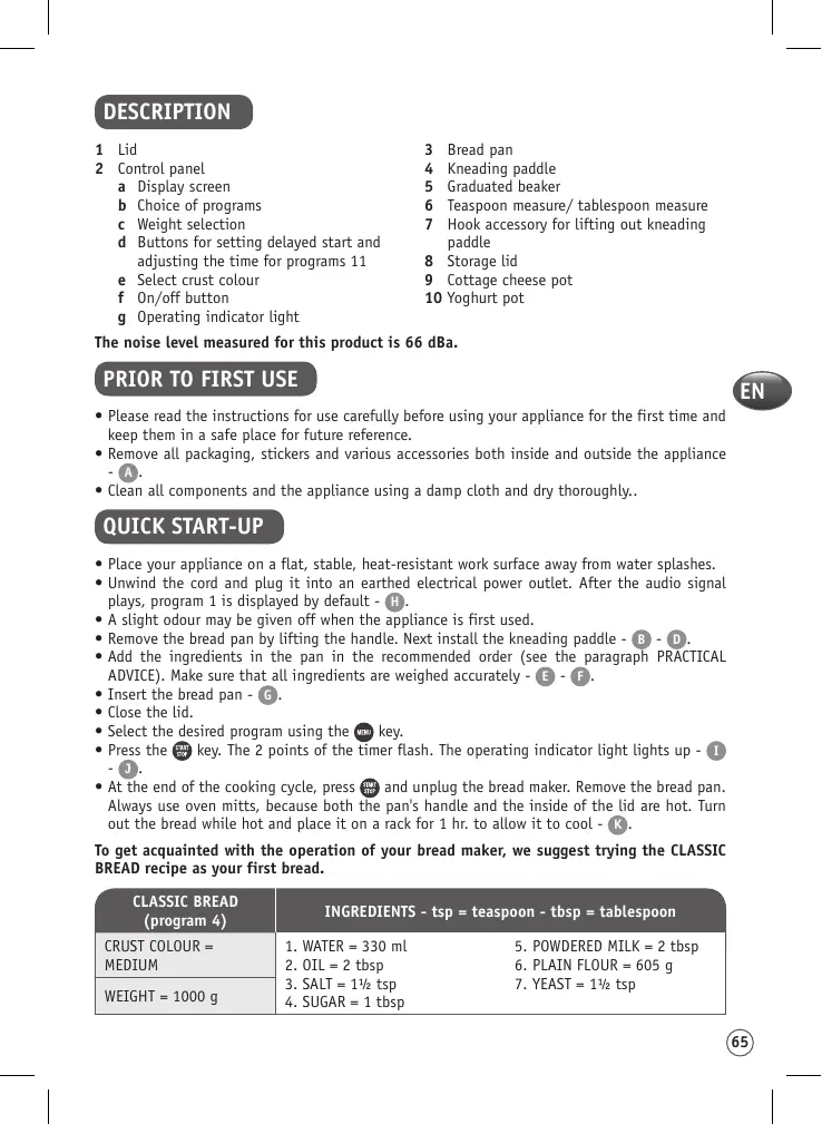 • Place your appliance on a flat, stable, heat-resistant work surface away from water splashes. • Unwind the cord and plug it into an earthed electrical power outlet. After the audio signal plays, program 1 is displayed by default - H . • A slight odour may be given off when the appliance is first used. • Remove the bread pan by lifting the handle. Next install the kneading paddle - B - D . • Add the ingredients in the pan in the recommended order (see the paragraph PRACTICAL ADVICE). Make sure that all ingredients are weighed accurately - E - F . • Insert the bread pan - G . • Close the lid. • Select the desired program using the key. • Press the key. The 2 points of the timer flash. The operating indicator light lights up - I - J . • At the end of the cooking cycle, press and unplug the bread maker. Remove the bread pan. Always use oven mitts, because both the pan's handle and the inside of the lid are hot. Turn out the bread while hot and place it on a rack for 1 hr. to allow it to cool - K . To get acquainted with the operation of your bread maker, we suggest trying the CLASSIC BREAD recipe as your first bread. CLASSIC BREAD (program 4) CRUST COLOUR = MEDIUM WEIGHT = 1000 g