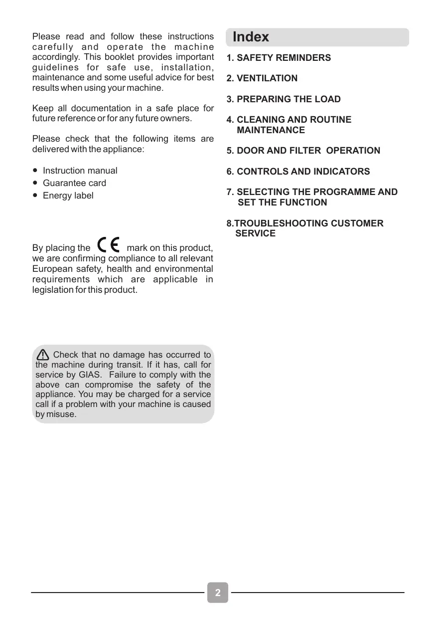8.TROUBLESHOOTING CUSTOMER SERVICE By placing the mark on this product, we are confirming compliance to all relevant European safety, health and environmental requirements which are applicable in legislation for this product. Check that no damage has occurred to the machine during transit. If it has, call for service by GIAS. Failure to comply with the above can compromise the safety of the appliance. You may be charged for a service call if a problem with your machine is caused by misuse.