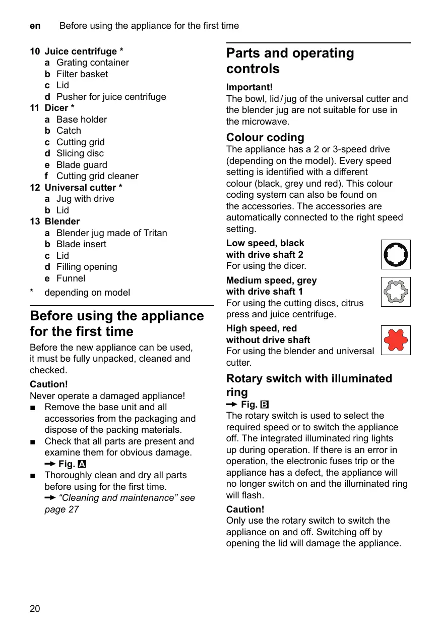 depending on model Before using the appliance for the first time Before the new appliance can be used, it must be fully unpacked, cleaned and checked. Caution! Never operate a damaged appliance! ■ Remove the base unit and all accessories from the packaging and dispose of the packing materials. ■ Check that all parts are present and examine them for obvious damage. X Fig. A ■ Thoroughly clean and dry all parts before using for the first time. X “Cleaning and maintenance” see page 27