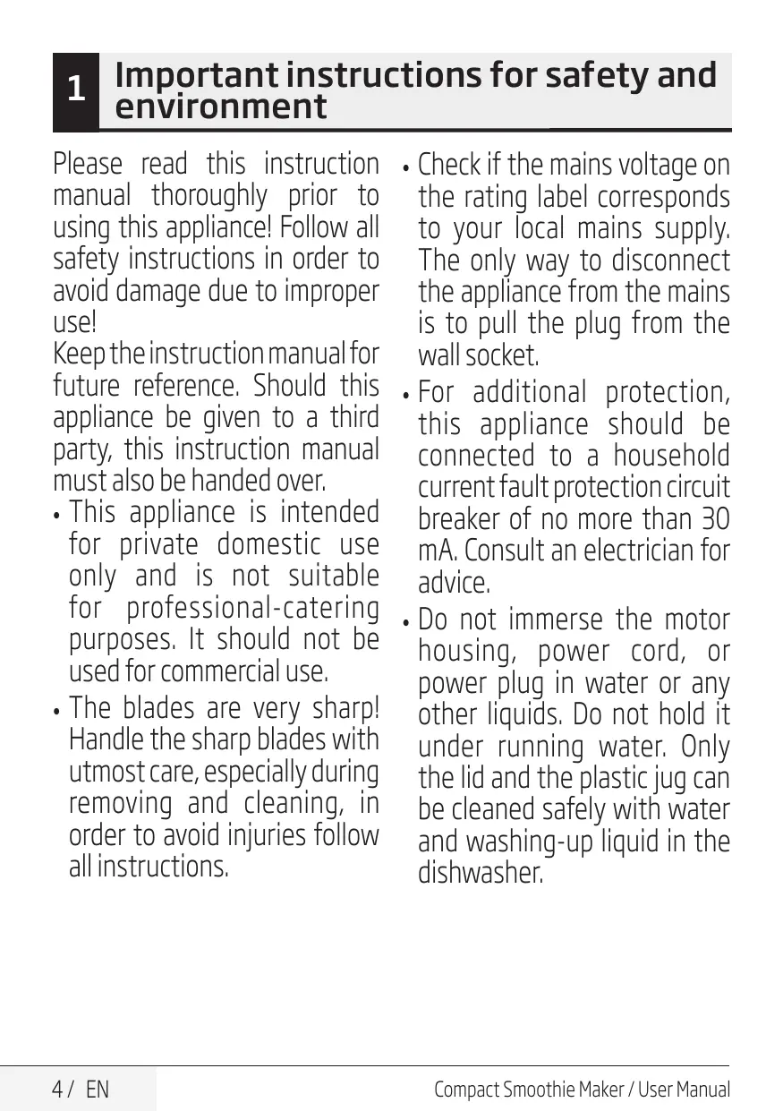 The only way to disconnect the appliance from the mains is to pull the plug from the wall socket. • For additional protection, this appliance should be connected to a household current fault protection circuit breaker of no more than 30 mA. Consult an electrician for advice. • Do not immerse the motor housing, power cord, or power plug in water or any other liquids. Do not hold it under running water. Only the lid and the plastic jug can be cleaned safely with water and washing-up liquid in the dishwasher. •
