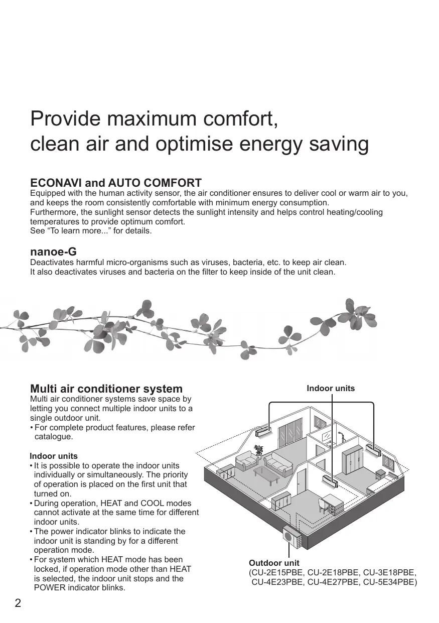 Operating Instructions Air Conditioner Operating Instructions Air Conditioner Thank you for purchasing Panasonic Air Conditioner. Installation instructions attached. Before operating the unit, read these operating instructions thoroughly and keep them for future reference. Multi Split CS-E7QKEW CS-E9QKEW CS-E12QKEW CS-E15QKEW CS-E18QKEW CS-E21QKEW CS-E24QKEW Outdoor Unit Single Split E series 12-21 Italiano CS-XE7QKEW CS-XE9QKEW CS-XE12QKEW CS-XE18QKEW Model No. Indoor Unit INVERTER DELUXE XE series English 2-11 Provide maximum comfort, clean air and optimise energy saving ECONAVI and AUTO COMFORT Equipped with the human activity sensor, the air conditioner ensures to deliver cool or warm air to you, and keeps the room consistently comfortable with minimum energy consumption. Furthermore, the sunlight sensor detects the sunlight intensity and helps control heating/cooling temperatures to provide optimum comfort. See “To learn more...” for details. nanoe-G Deactivates harmful micro-organisms such as viruses, bacteria, etc. to keep air clean. It also deactivates viruses and bacteria on the filter to keep inside of the unit clean. Multi air conditioner system Indoor units Multi air conditioner systems save space by letting you connect multiple indoor units to a single outdoor unit.