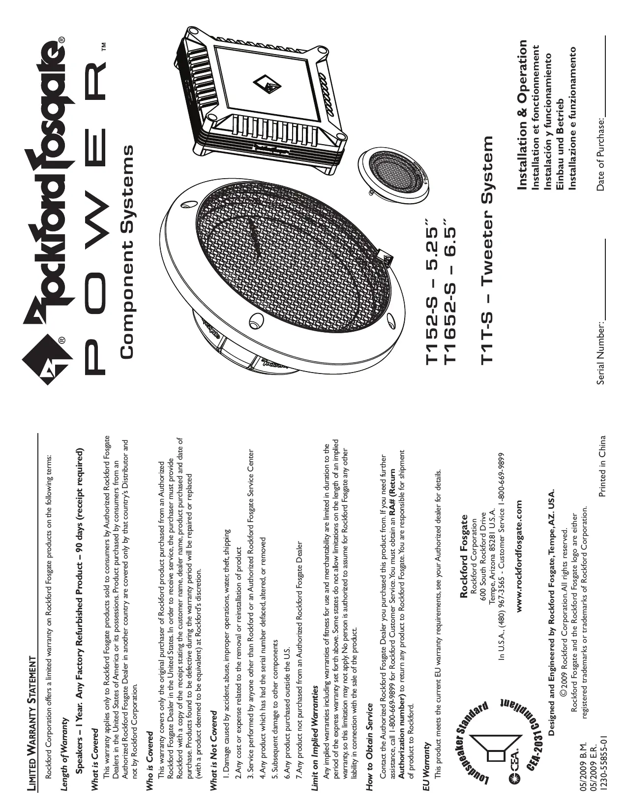 05/2009 B.M. 05/2009 E.R. 1230-55855-01 2009 Rockford Corporation. All rights reserved. Rockford Fosgate and the Rockford Fosgate logo are either registered trademarks or trademarks of Rockford Corporation. Printed in China Designed and Engineered by Rockford Fosgate,Tempe, AZ. USA. www.rockfordfosgate.com Rockford Corporation 600 South Rockford Drive Tempe, Arizona 85281 U.S.A. In U.S.A., (480) 967-3565 - Customer Service 1-800-669-9899 Rockford Fosgate This product meets the current EU warranty requirements, see your Authorized dealer for details. EU Warranty Contact the Authorized Rockford Fosgate Dealer you purchased this product from. If you need further assistance, call 1-800-669-9899 for Rockford Customer Service.You must obtain an RA# (Return Authorization number) to return any product to Rockford Fosgate.You are responsible for shipment of product to Rockford. How to Obtain Service Any implied warranties including warranties of fitness for use and merchantability are limited in duration to the period of the express warranty set forth above. Some states do not allow limitations on the length of an implied warranty, so this limitation may not apply. No person is authorized to assume for Rockford Fosgate any other liability in connection with the sale of the product. Limit on Implied Warranties