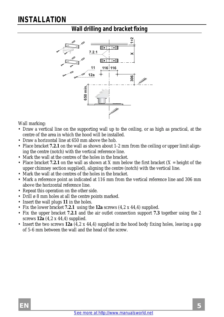- Fix the lower bracket 7.2.1 using the 12a screws (4,2 x 44,4) supplied.