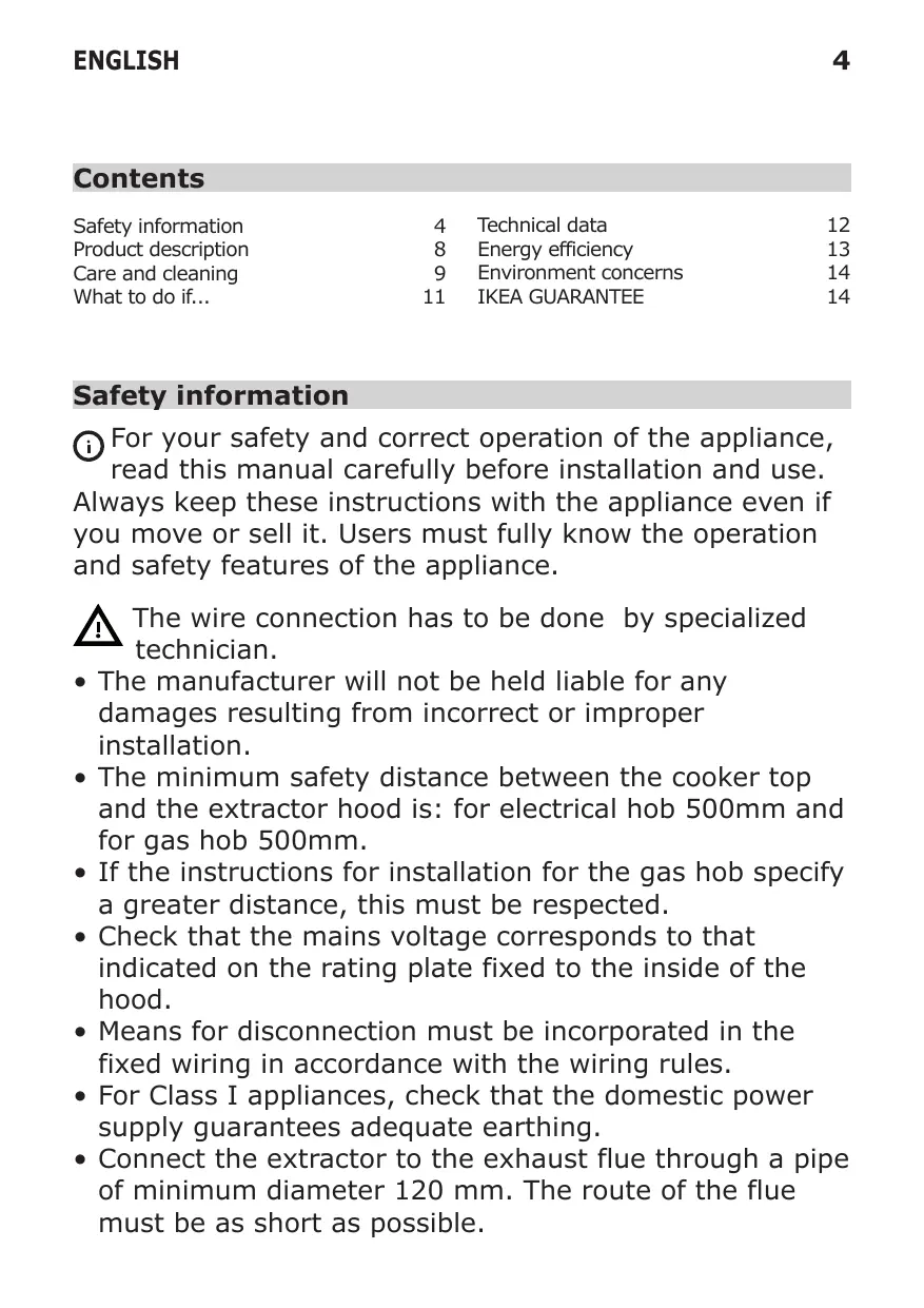 The wire connection has to be done by specialized technician. The manufacturer will not be held liable for any damages resulting from incorrect or improper installation. The minimum safety distance between the cooker top and the extractor hood is: for electrical hob 500mm and for gas hob 500mm. If the instructions for installation for the gas hob specify a greater distance, this must be respected. Check that the mains voltage corresponds to that indicated on the rating plate fixed to the inside of the hood. Means for disconnection must be incorporated in the fixed wiring in accordance with the wiring rules. For Class I appliances, check that the domestic power supply guarantees adequate earthing. Connect the extractor to the exhaust flue through a pipe of minimum diameter 120 mm. The route of the flue must be as short as possible. ENGLISH