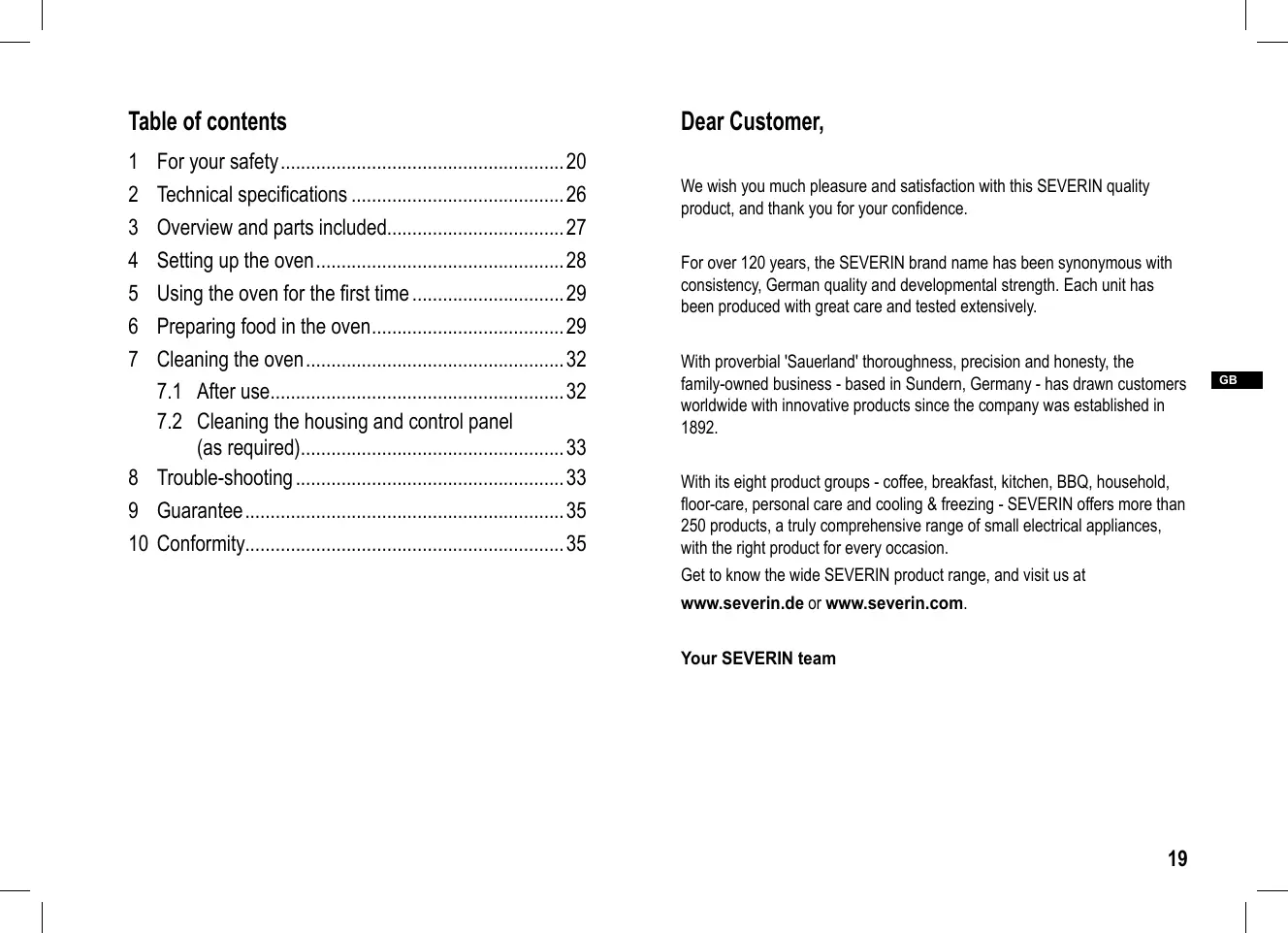 - 10 Conformity Dear Customer, We wish you much pleasure and satisfaction with this SEVERIN quality product, and thank you for your confidence. For over 120 years, the SEVERIN brand name has been synonymous with consistency, German quality and developmental strength. Each unit has been produced with great care and tested extensively. With proverbial 'Sauerland' thoroughness, precision and honesty, the family-owned business - based in Sundern, Germany - has drawn customers worldwide with innovative products since the company was established in With its eight product groups - coffee, breakfast, kitchen, BBQ, household, floor-care, personal care and cooling & freezing - SEVERIN offers more than 250 products, a truly comprehensive range of small electrical appliances, with the right product for every occasion. Get to know the wide SEVERIN product range, and visit us at www.severin.de or www.severin.com. Your SEVERIN team p. 35