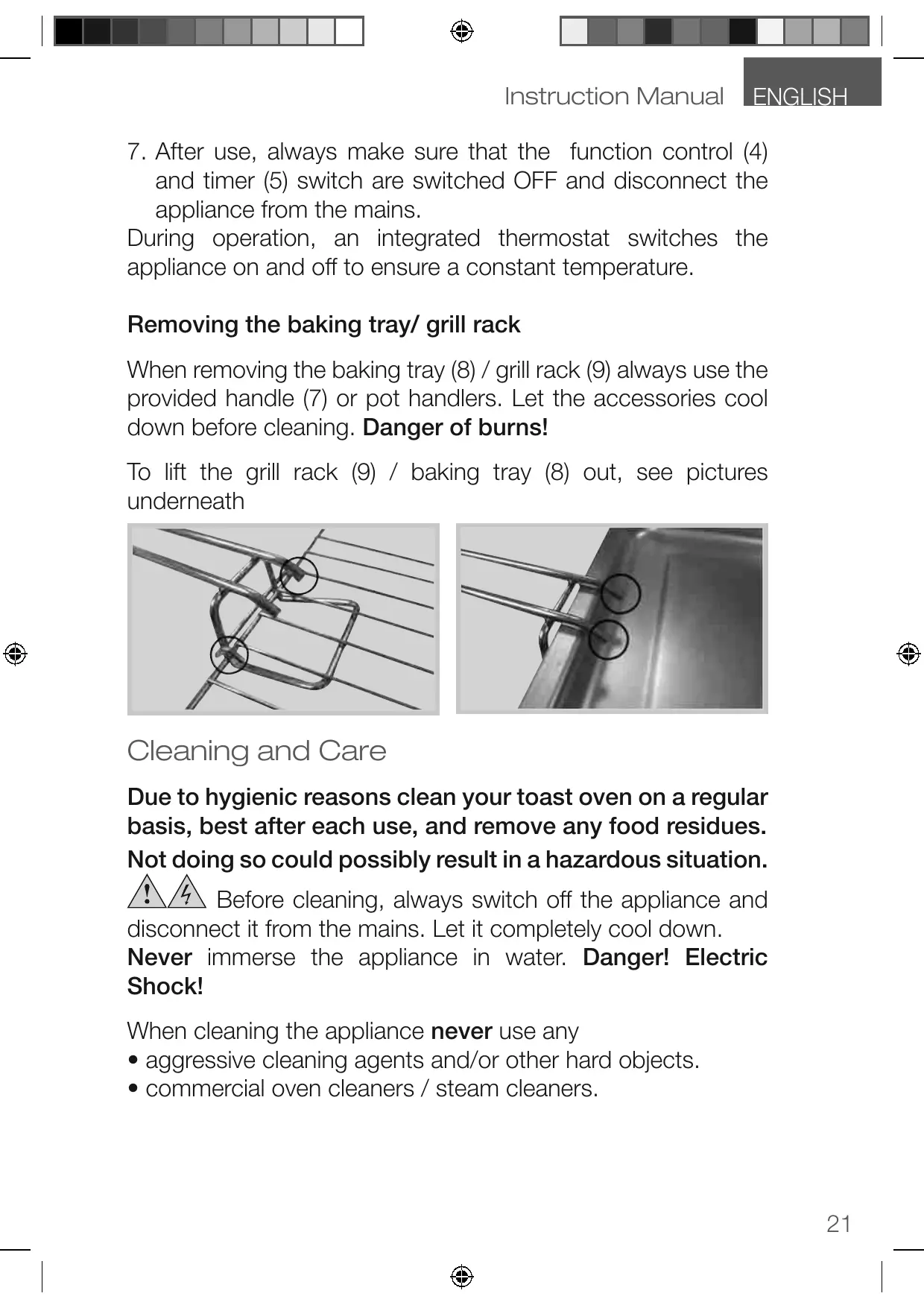 When removing the baking tray (8) / grill rack (9) always use the provided handle (7) or pot handlers. Let the accessories cool down before cleaning. Danger of burns!