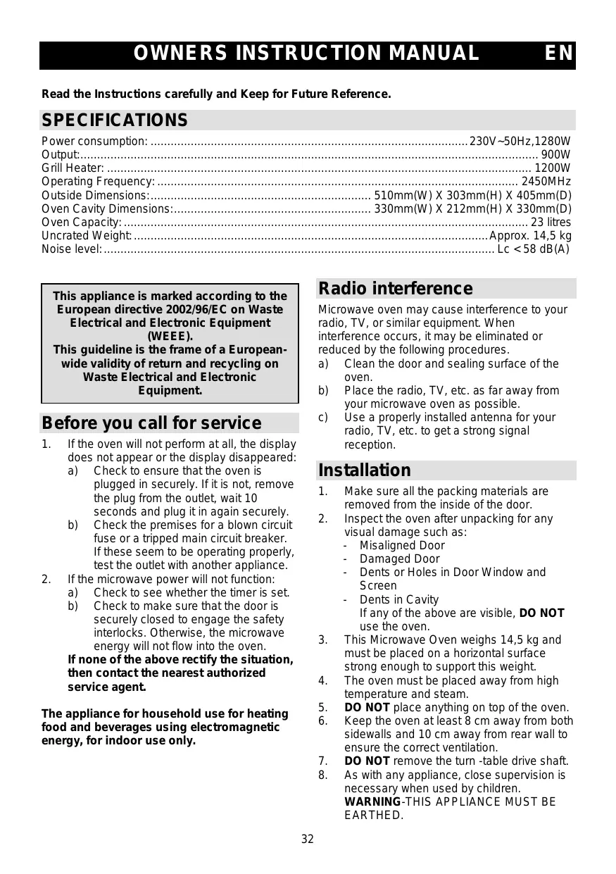 Read the Instructions carefully and Keep for Future Reference. This appliance is marked according to the European directive 2002/96/EC on Waste Electrical and Electronic Equipment (WEEE). This guideline is the frame of a Europeanwide validity of return and recycling on Waste Electrical and Electronic Equipment. Microwave oven may cause interference to your radio, TV, or similar equipment. When interference occurs, it may be eliminated or reduced by the following procedures. a) Clean the door and sealing surface of the oven. b) Place the radio, TV, etc. as far away from your microwave oven as possible. c) Use a properly installed antenna for your radio, TV, etc. to get a strong signal reception. Before you call for service