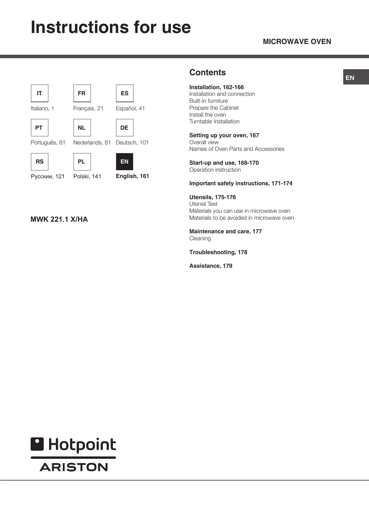 Installation and connection Built-in furniture Prepare the Cabinet Install the oven Turntable Installation Setting up your oven, 167 Overall view Names of Oven Parts and Accessories Start-up and use, 168-170 Operation instruction Important safety instructions, 171-174 Utensils, 175-176 Utensil Test Materials you can use in microwave oven Materials to be avoided in microwave oven Maintenance and care, 177 Cleaning Troubleshooting, 178 Assistance, 179