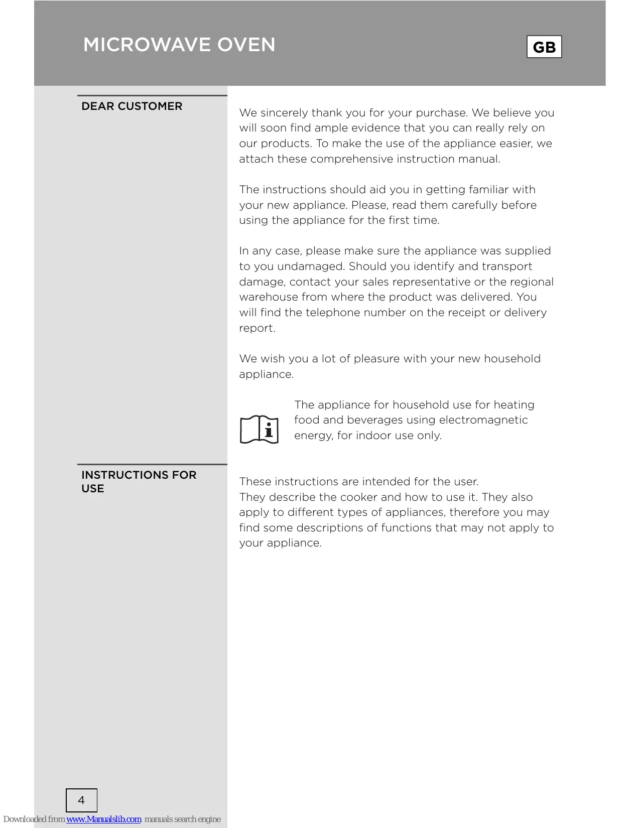 We sincerely thank you for your purchase. We believe you will soon find ample evidence that you can really rely on our products. To make the use of the appliance easier, we attach these comprehensive instruction manual. The instructions should aid you in getting familiar with your new appliance. Please, read them carefully before using the appliance for the first time. In any case, please make sure the appliance was supplied to you undamaged. Should you identify and transport damage, contact your sales representative or the regional warehouse from where the product was delivered. You will find the telephone number on the receipt or delivery report. We wish you a lot of pleasure with your new household appliance. The appliance for household use for heating food and beverages using electromagnetic energy, for indoor use only. INSTRUCTIONS FOR USE