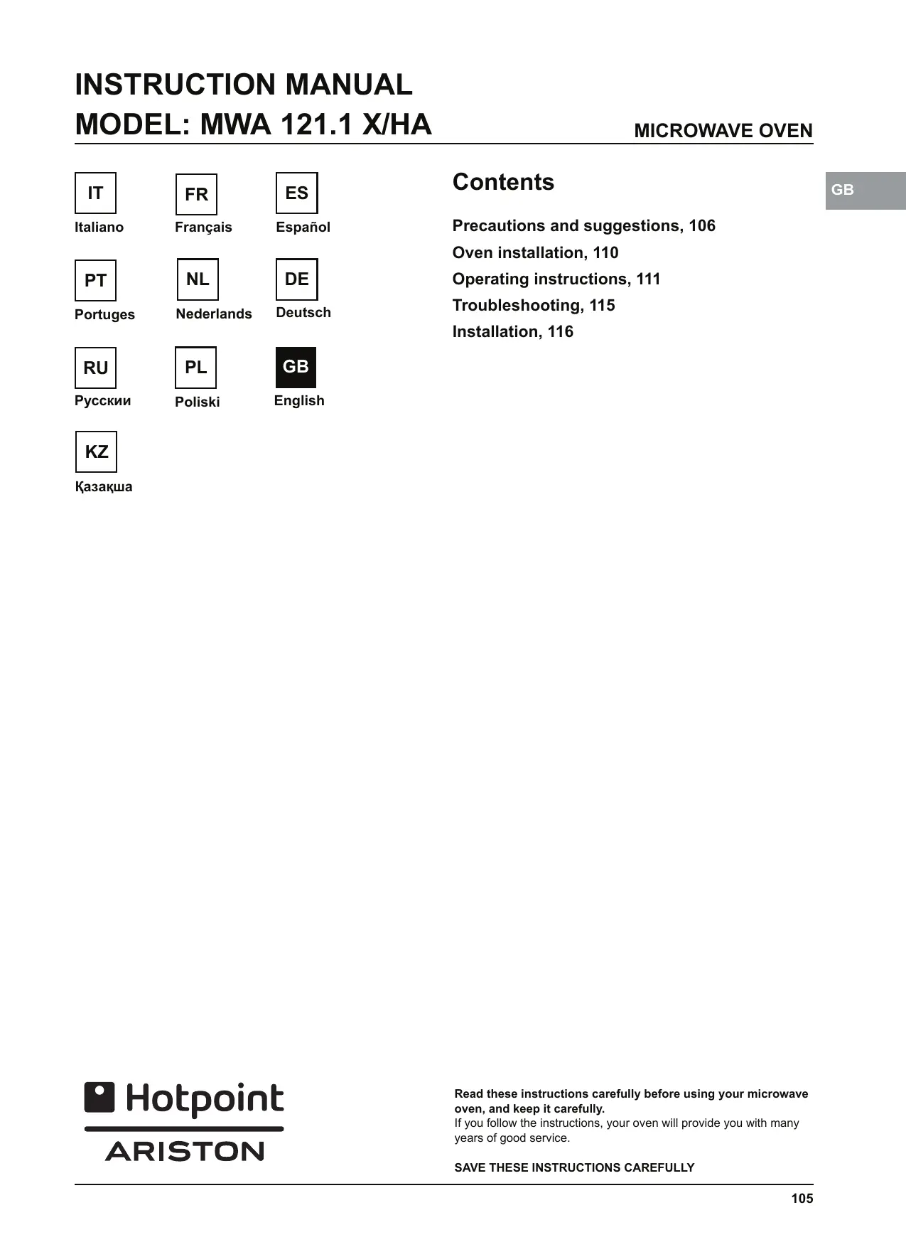 Download the instructions for your Microwave Oven in PDF format for free! Find your manual MWH2322B - HOTPOINT and take your electronic device back in hand. On this page are published all the documents necessary for the use of your device. MWH2322B by HOTPOINT.