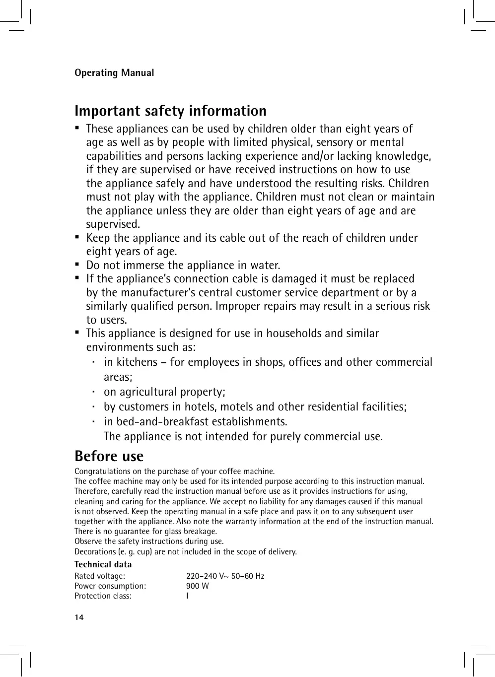▪▪ These appliances can be used by children older than eight years of age as well as by people with limited physical, sensory or mental capabilities and persons lacking experience and/or lacking knowledge, if they are supervised or have received instructions on how to use the appliance safely and have understood the resulting risks. Children must not play with the appliance. Children must not clean or maintain the appliance unless they are older than eight years of age and are supervised. ▪▪ Keep the appliance and its cable out of the reach of children under eight years of age. ▪▪ Do not immerse the appliance in water. ▪▪ If the appliance’s connection cable is damaged it must be replaced by the manufacturer’s central customer service department or by a similarly qualified person. Improper repairs may result in a serious risk to users. ▪▪ This appliance is designed for use in households and similar environments such as: ⋅⋅ in kitchens – for employees in shops, offices and other commercial areas; ⋅⋅ on agricultural property; ⋅⋅ by customers in hotels, motels and other residential facilities; ⋅⋅ in bed-and-breakfast establishments. The appliance is not intended for purely commercial use.