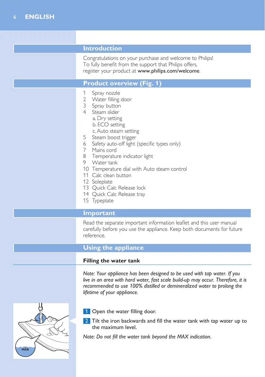 Filling the water tank Note: Your appliance has been designed to be used with tap water. If you live in an area with hard water, fast scale build-up may occur. Therefore, it is recommended to use 100% distilled or demineralized water to prolong the lifetime of your appliance. 1 Open the water filling door. 2 Tilt the iron backwards and fill the water tank with tap water up to the maximum level. Note: Do not fill the water tank beyond the MAX indication.
