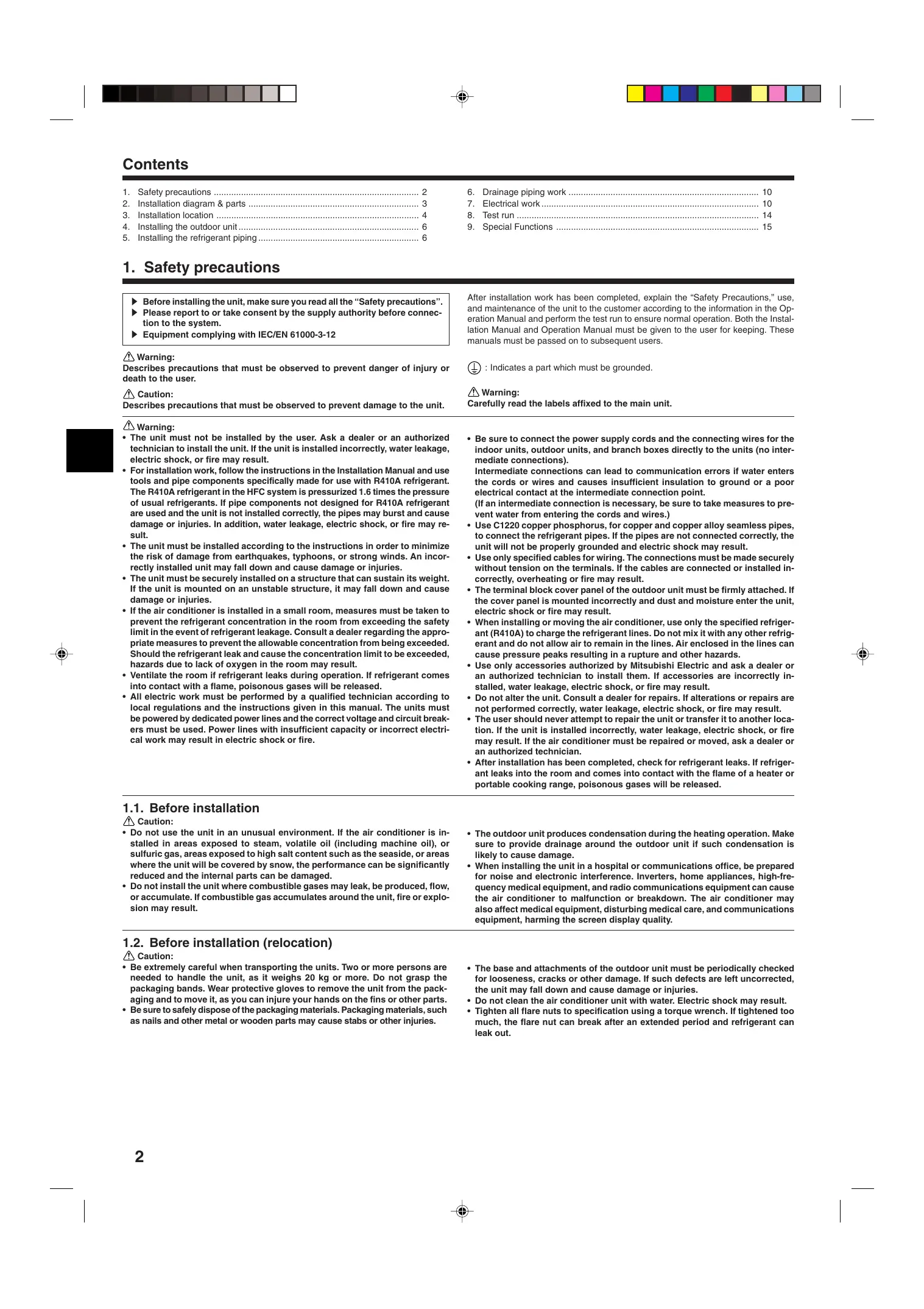 1. Safety precautions s Before installing the unit, make sure you read all the “Safety precautions”. s Please report to or take consent by the supply authority before connection to the system. s Equipment complying with IEC/EN 61000-3-12