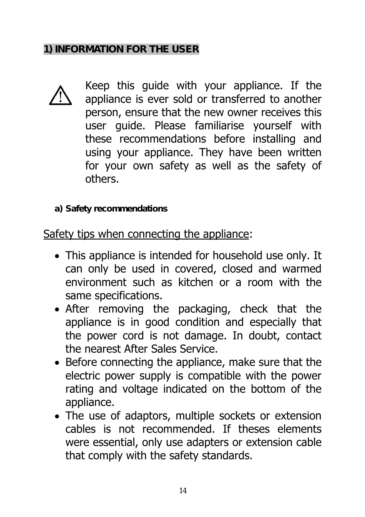 Keep this guide with your appliance. If the appliance is ever sold or transferred to another person, ensure that the new owner receives this user guide. Please familiarise yourself with these recommendations before installing and using your appliance. They have been written for your own safety as well as the safety of others.