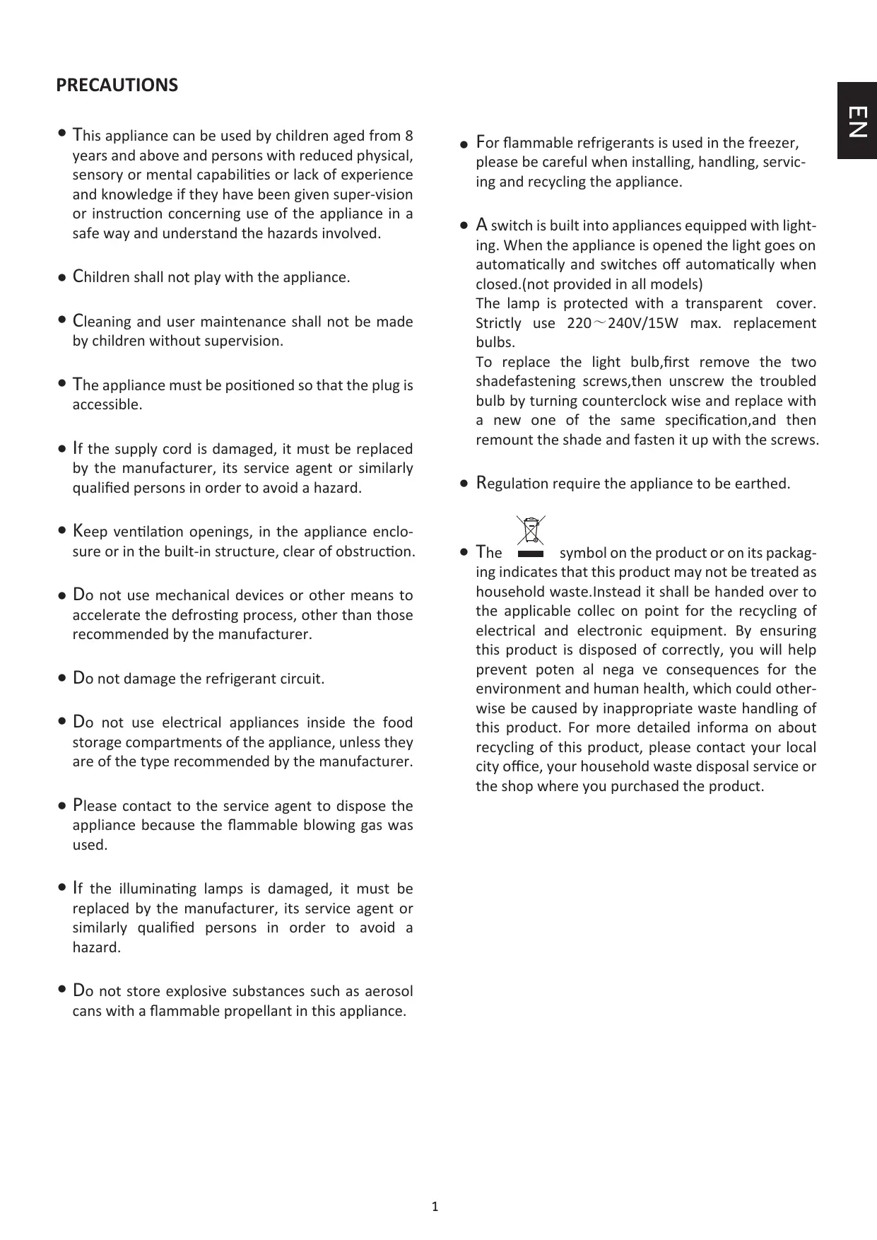 This noise is produced when the motor in the compressor operates and also by refrigerant flowing in the cooling system circuit. These noises are normal. 4. Consensation build up on external walls Under certain atmospheric conditions, condensation can from on external walls of the appliance. This is normal and won’t affect the function of the appliance.