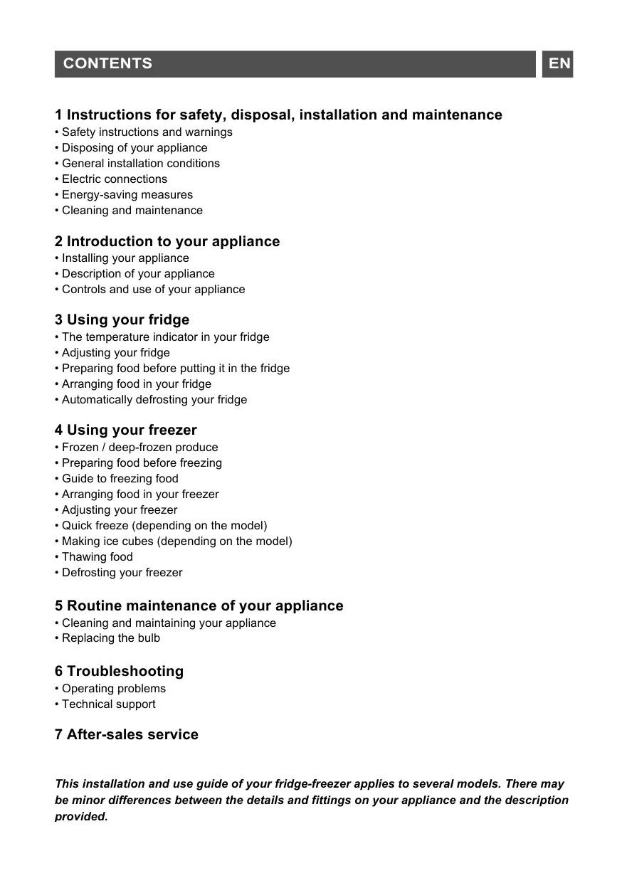 This installation and use guide of your fridge-freezer applies to several models. There may be minor differences between the details and fittings on your appliance and the description provided.