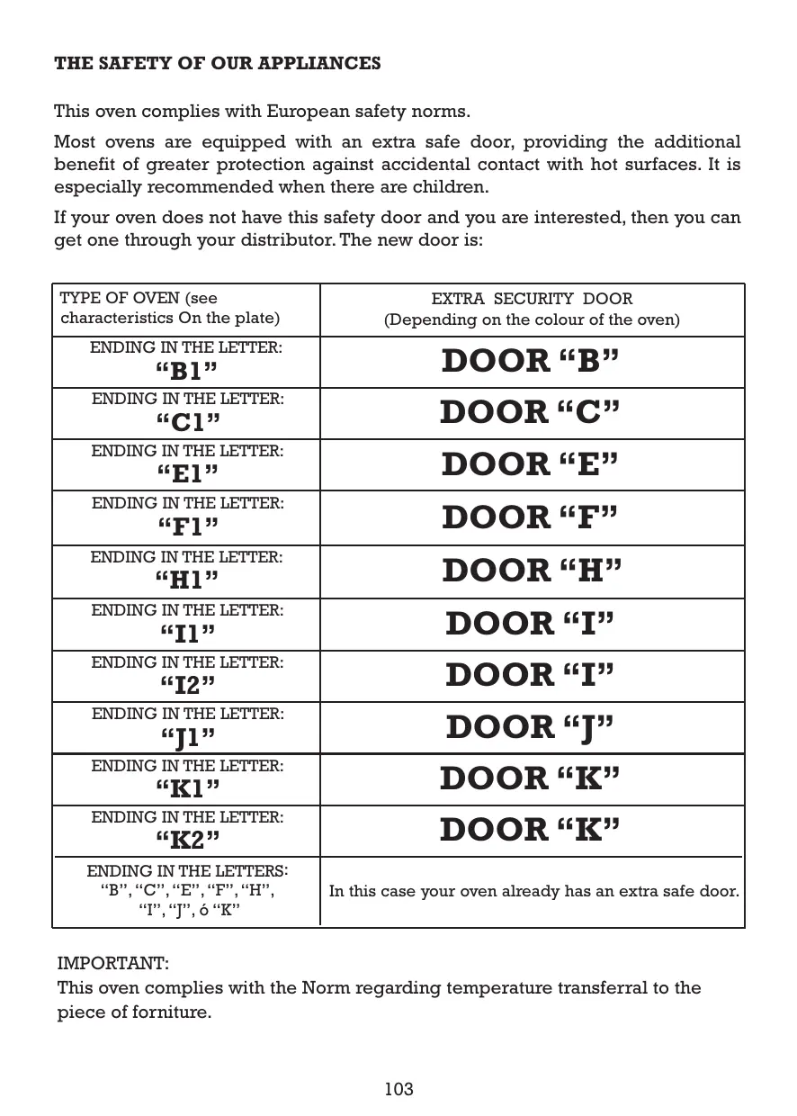 Most ovens are equipped with an extra safe door, providing the additional benefit of greater protection against accidental contact with hot surfaces. It is especially recommended when there are children. If your oven does not have this safety door and you are interested, then you can get one through your distributor. The new door is: TYPE OF OVEN (see characteristics On the plate)