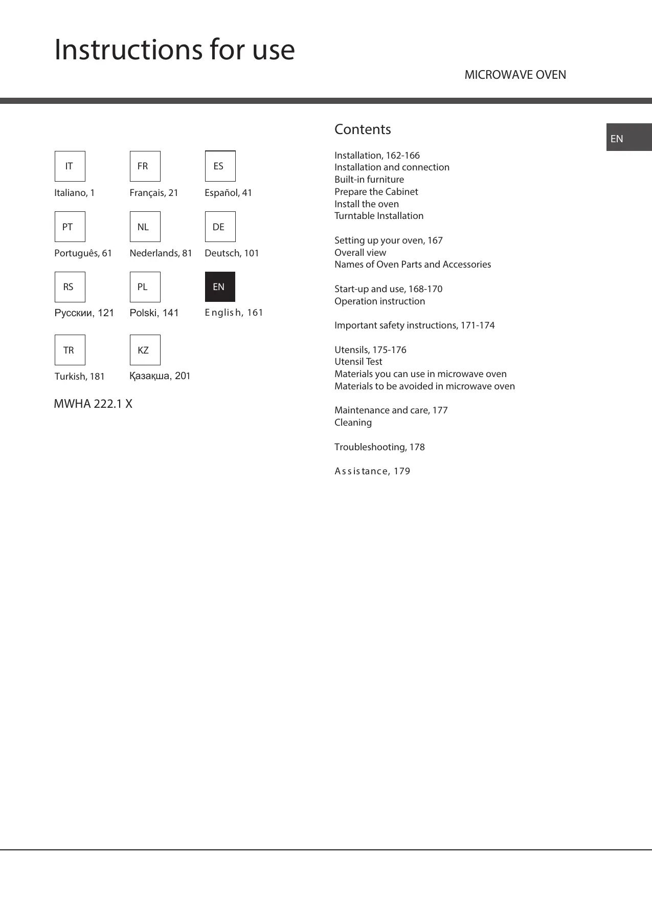 Installation and connection Built-in furniture Prepare the Cabinet Install the oven Turntable Installation Setting up your oven, 167 Overall view Names of Oven Parts and Accessories Start-up and use, 168-170 Operation instruction Important safety instructions, 171-174 Utensils, 175-176 Utensil Test Materials you can use in microwave oven Materials to be avoided in microwave oven Maintenance and care, 177 Cleaning Troubleshooting, 178 A s s is tanc e, 1 79