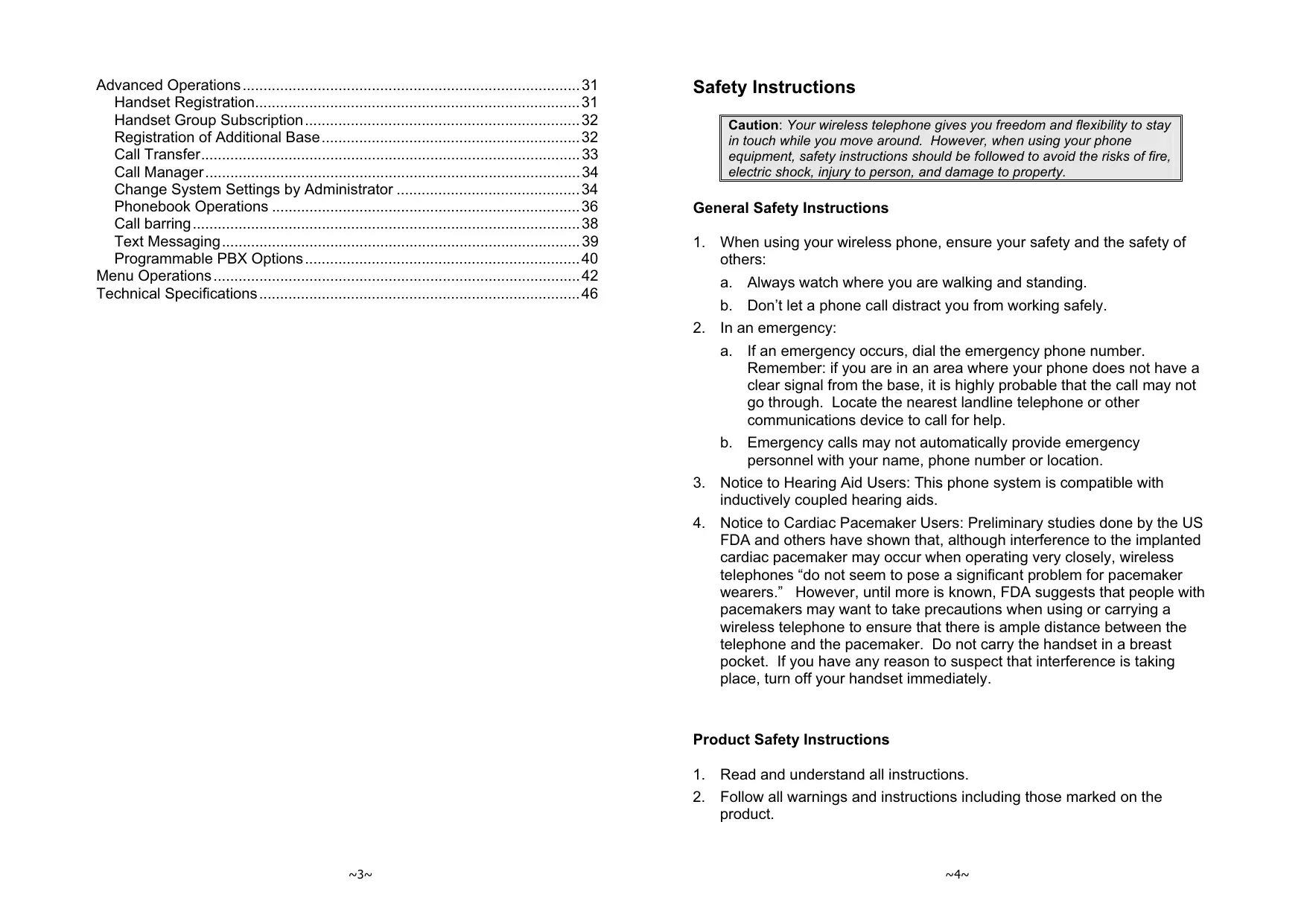 ~45~ NA = Not Applicable. The manufacturer reserves the right to change designs and specifications without notice. ~46~ Index 2-Way/Intercom, 12, 24, 34 Adjusting Receiver (Earpiece) Voice Volume, 28 Administrator Features, 15 Audio-in Jack, 17 Base Station Features, 17 Base Station Installation, 20 Battery, 5, 6, 9, 11, 14, 19, 20, 21, 22, 28, 30, 46 Battery Recharge and Replacement, 29 Battery Strength, 11 Broadcast, 12, 17, 22, 25, 26 Broadcasting a Group of Handsets, 25 Broadcasting all Handsets, 25, 26 Broadcasting an Individual Handset, 25 Call Barring, 13, 38, 39, 45 Call Manager, 34, 35, 45 Call Timer, 14 Call Transfer, 15, 33, 35 Call Transfer to PBX Extension, 15 Call Hold, 14 Caller ID, 13, 27, 29, 43 Call in-progress, 11 Call Waiting, 12 Call Waiting with Caller ID, 13 Cardiac Pacemaker, 4 Change System Settings by Administrator, 34 Charger Features, 19 De-registration, 31,32 DND, 13 Do Not Disturb (Silent Ring), 13, 29 DTMF, 15