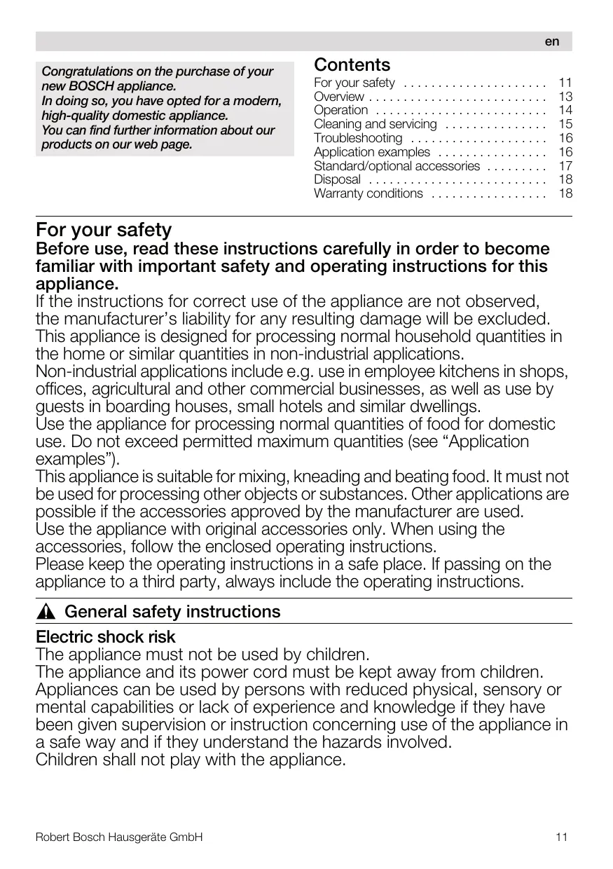 For your safety Before use, read these instructions carefully in order to become familiar with important safety and operating instructions for this appliance. If the instructions for correct use of the appliance are not observed, the manufacturer’s liability for any resulting damage will be excluded. This appliance is designed for processing normal household quantities in the home or similar quantities in non-industrial applications. Non-industrial applications include e.g. use in employee kitchens in shops, offices, agricultural and other commercial businesses, as well as use by guests in boarding houses, small hotels and similar dwellings. Use the appliance for processing normal quantities of food for domestic use. Do not exceed permitted maximum quantities (see “Application examples”). This appliance is suitable for mixing, kneading and beating food. It must not be used for processing other objects or substances. Other applications are possible if the accessories approved by the manufacturer are used. Use the appliance with original accessories only. When using the accessories, follow the enclosed operating instructions. Please keep the operating instructions in a safe place. If passing on the appliance to a third party, always include the operating instructions. , General safety instructions Electric shock risk The appliance must not be used by children. The appliance and its power cord must be kept away from children. Appliances can be used by persons with reduced physical, sensory or mental capabilities or lack of experience and knowledge if they have been given supervision or instruction concerning use of the appliance in a safe way and if they understand the hazards involved. Children shall not play with the appliance. Connect and operate the appliance only in accordance with the specifications on the rating plate. Do not use the appliance if the power cord and/or appliance are damaged. Always disconnect the appliance from the supply if it is left unattended and before assembling, disassembling or cleaning. Do not place the power cord over sharp edges or hot surfaces. To prevent injury, a damaged power cord must be replaced by the manufacturer or his customer service or a similarly qualified person. Only our customer service may repair the appliance. , Safety instructions for this appliance Risk of injury Risk of electric shock! Do not insert mains plug until all preparations for working with the appliance are complete. Never immerse the base unit in liquid or hold under running water. Do not use a steam cleaner. Do not adjust the swivel arm while the appliance is switched on. Wait until the drive has come to a standstill. Do not change tool/accessory until the drive is at a standstill – when the appliance is switched off, the drive continues running briefly. Use only the rotary switch to switch the appliance on or off. When the appliance is not in use, pull out the mains plug. Before eliminating a fault, pull out the mains plug. The appliance restarts following a power interruption. Risk of injury from the rotating tools! Keep hands clear of rotating parts. While the appliance is operating, keep fingers clear of the mixing bowl. Do not change tools until the drive has come to a standstill – when the appliance is switched off, the drive continues running briefly. The appliance may only be operated when the unused drives have been safeguarded with the drive covers (4, 7). Risk of injury from sharp blades/rotating drive! Never place fingers in the attached blender! Never assemble blender on the base unit. Do not remove/attach the blender until the drive is at a standstill! Operate the assembled blender only and with the lid attached. Do not touch blender blades with bare hands. Risk of scalding! If processing hot liquids, steam escapes through the funnel in the lid. Add a max. 0.5 litres of hot or frothing liquid. Important! Use only one tool or accessory at any one time.