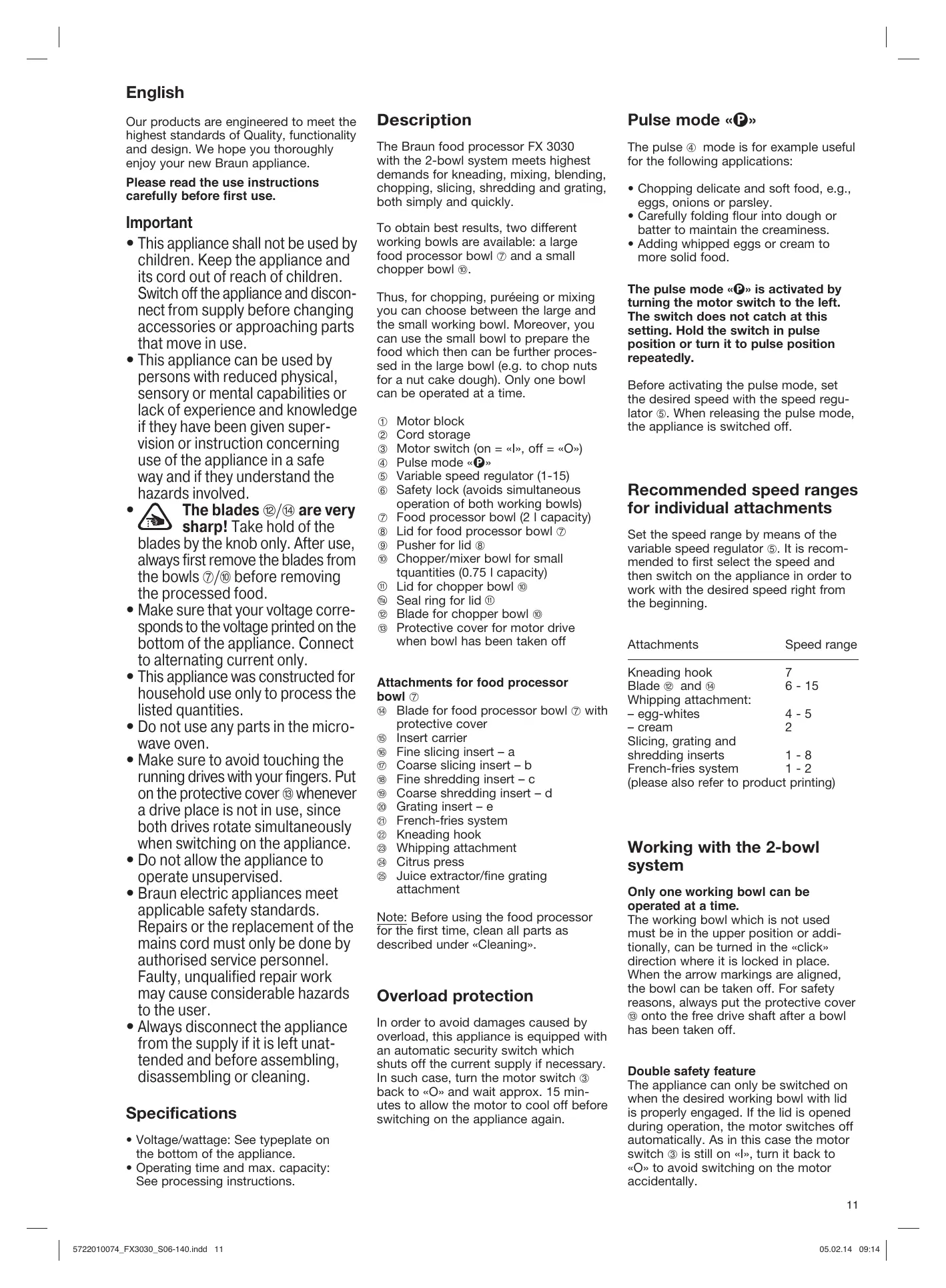 The blades 12 / 14 are very sharp! Take hold of the blades by the knob only. After use, always first remove the blades from the bowls ⑦ / 10 before removing the processed food. - Make sure that your voltage corresponds to the voltage printed on the bottom of the appliance. Connect to alternating current only.
