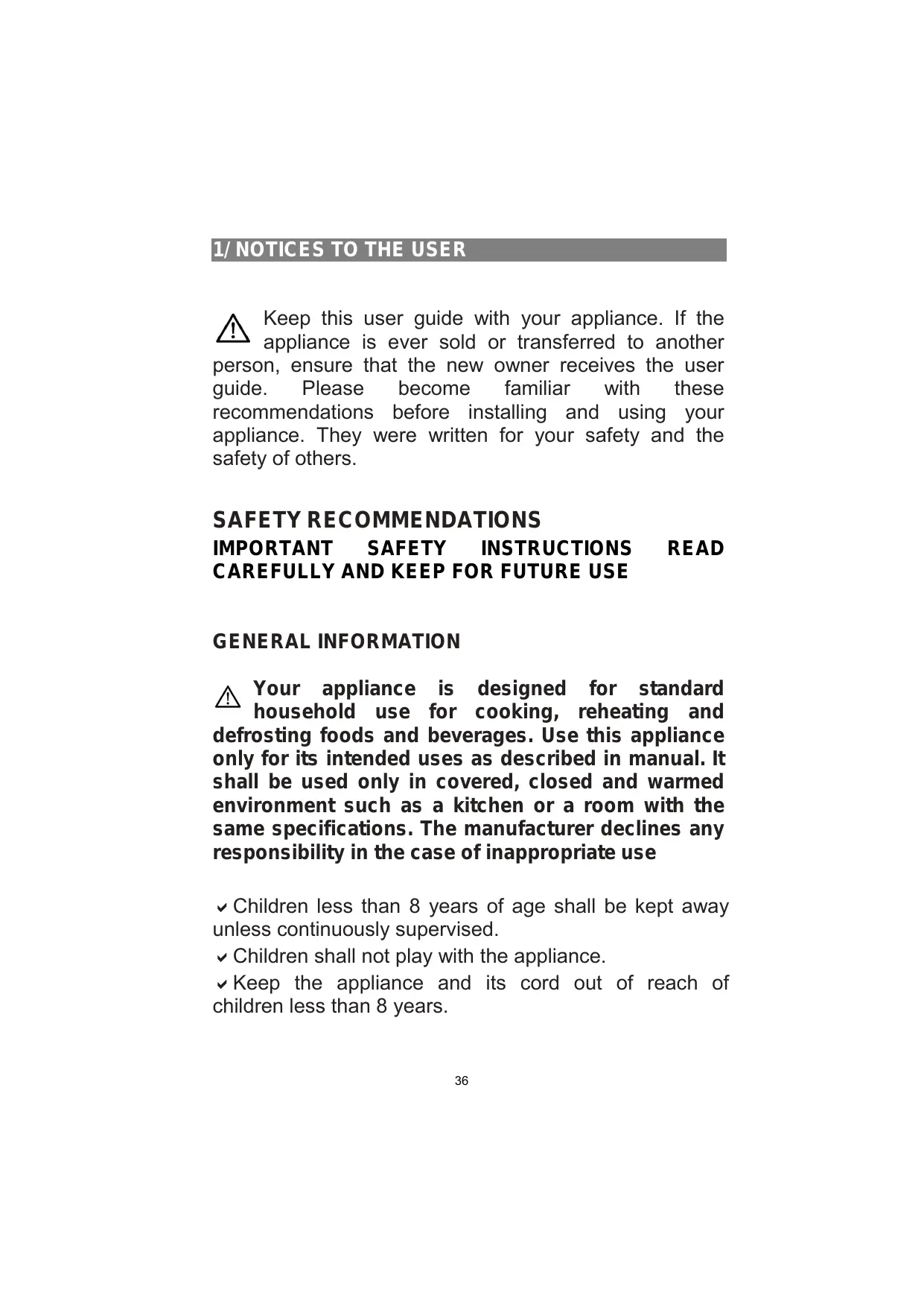 READ GENERAL INFORMATION Your appliance is designed for standard household use for cooking, reheating and defrosting foods and beverages. Use this appliance only for its intended uses as described in manual. It shall be used only in covered, closed and warmed environment such as a kitchen or a room with the same specifications. The manufacturer declines any responsibility in the case of inappropriate use Children less than 8 years of age shall be kept away unless continuously supervised. Children shall not play with the appliance. Keep the appliance and its cord out of reach of children less than 8 years.