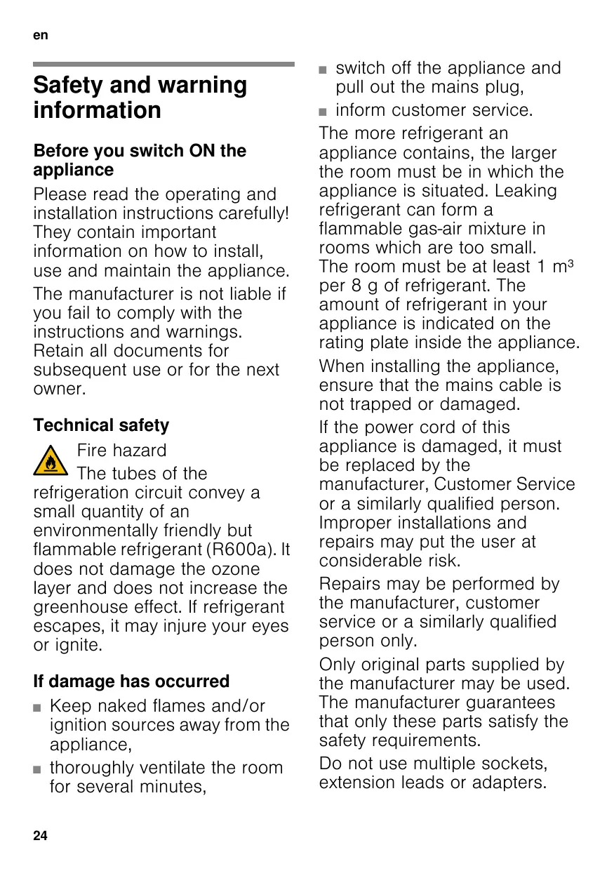 refrigeration circuit convey a small quantity of an environmentally friendly but flammable refrigerant (R600a). It does not damage the ozone layer and does not increase the greenhouse effect. If refrigerant escapes, it may injure your eyes or ignite.