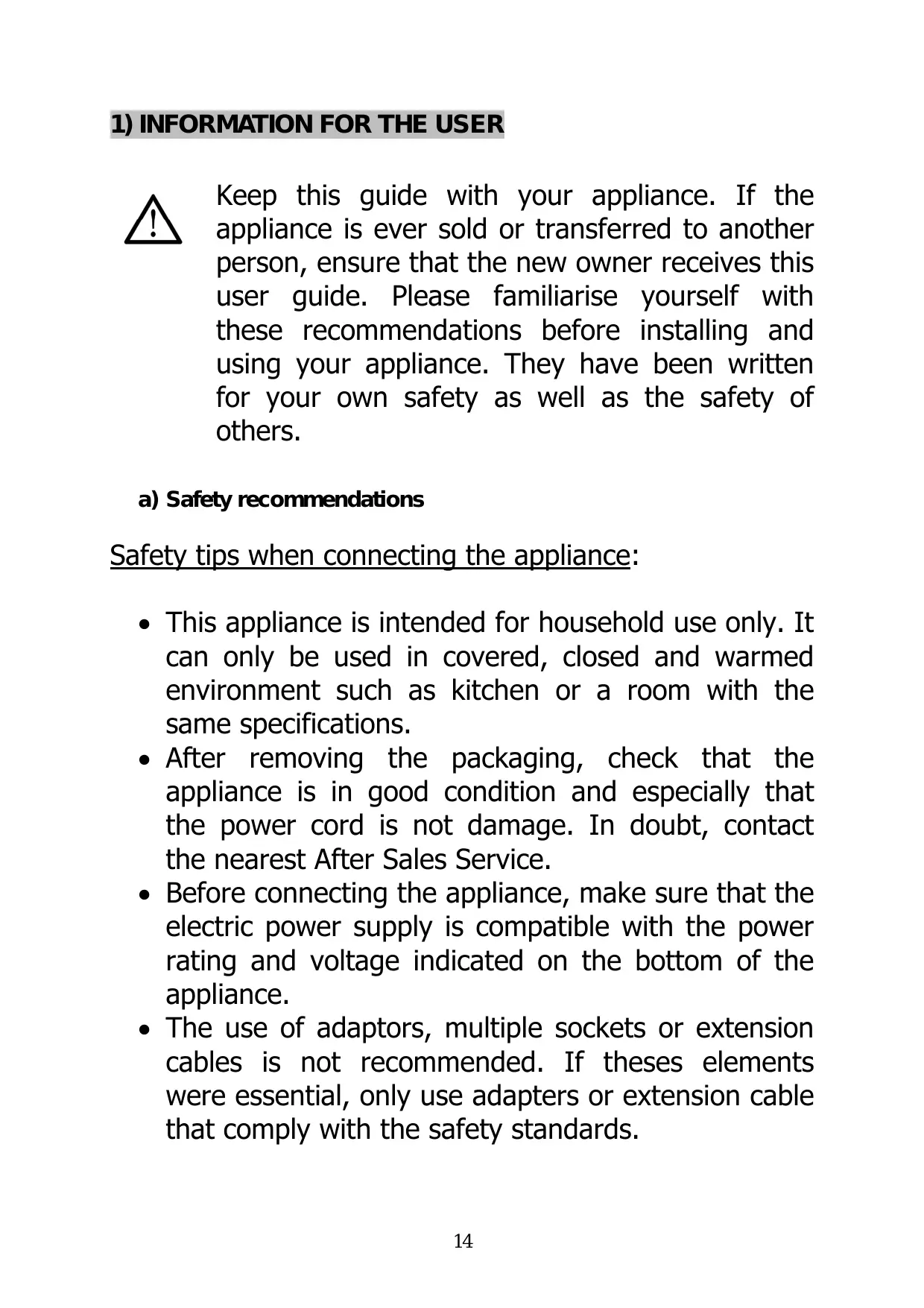 Keep this guide with your appliance. If the appliance is ever sold or transferred to another person, ensure that the new owner receives this user guide. Please familiarise yourself with these recommendations before installing and using your appliance. They have been written for your own safety as well as the safety of others.