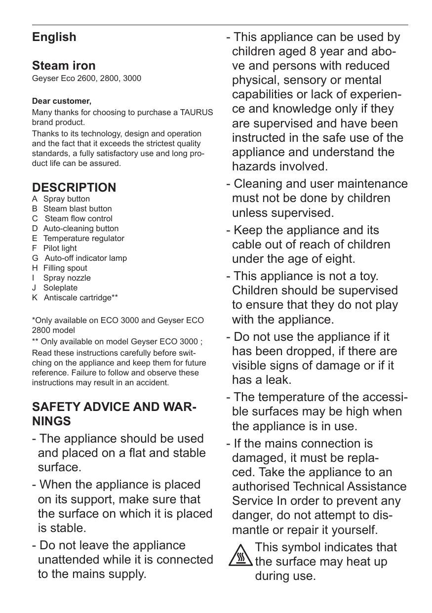 - Cleaning and user maintenance must not be done by children unless supervised. - Keep the appliance and its cable out of reach of children under the age of eight. - This appliance is not a toy. Children should be supervised to ensure that they do not play with the appliance. - Do not use the appliance if it has been dropped, if there are visible signs of damage or if it has a leak. - The temperature of the accessible surfaces may be high when the appliance is in use. - If the mains connection is damaged, it must be replaced. Take the appliance to an authorised Technical Assistance Service In order to prevent any danger, do not attempt to dismantle or repair it yourself. This symbol indicates that the surface may heat up during use.
