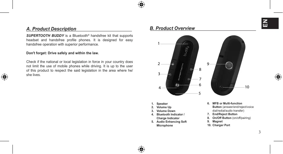 A. Product Description B. Product Overview SUPERTOOTH BUDDY is a Bluetooth® handsfree kit that supports headset and handsfree profile phones. It is designed for easy handsfree operation with superior performance. Don't forget: Drive safely and within the law. Check if the national or local legislation in force in your country does not limit the use of mobile phones while driving. It is up to the user of this product to respect the said legislation in the area where he/ she lives.