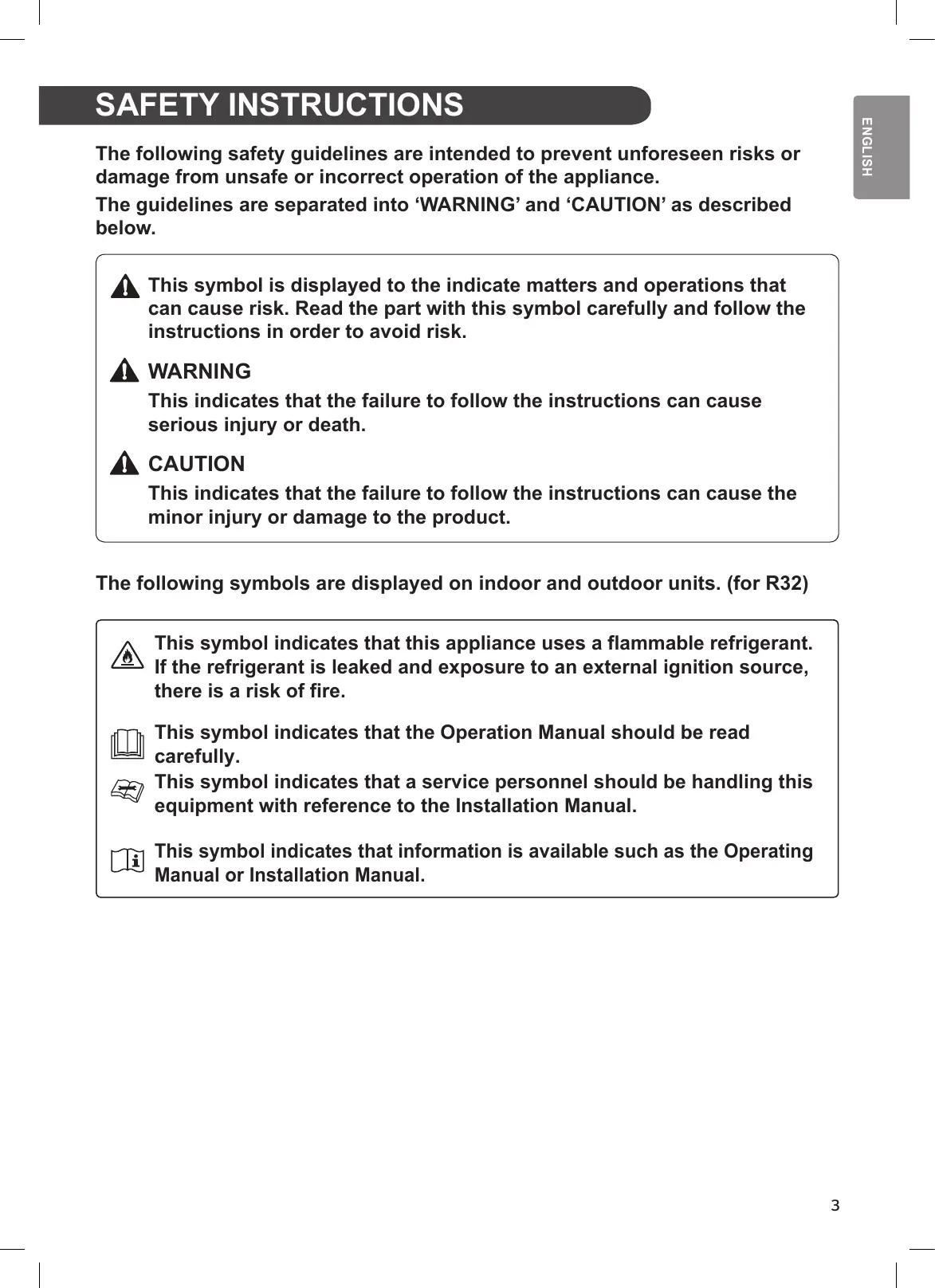 This symbol indicates that this appliance uses a flammable refrigerant. If the refrigerant is leaked and exposure to an external ignition source, there is a risk of fire. This symbol indicates that the Operation Manual should be read carefully. This symbol indicates that a service personnel should be handling this equipment with reference to the Installation Manual. This symbol indicates that information is available such as the Operating Manual or Installation Manual.
