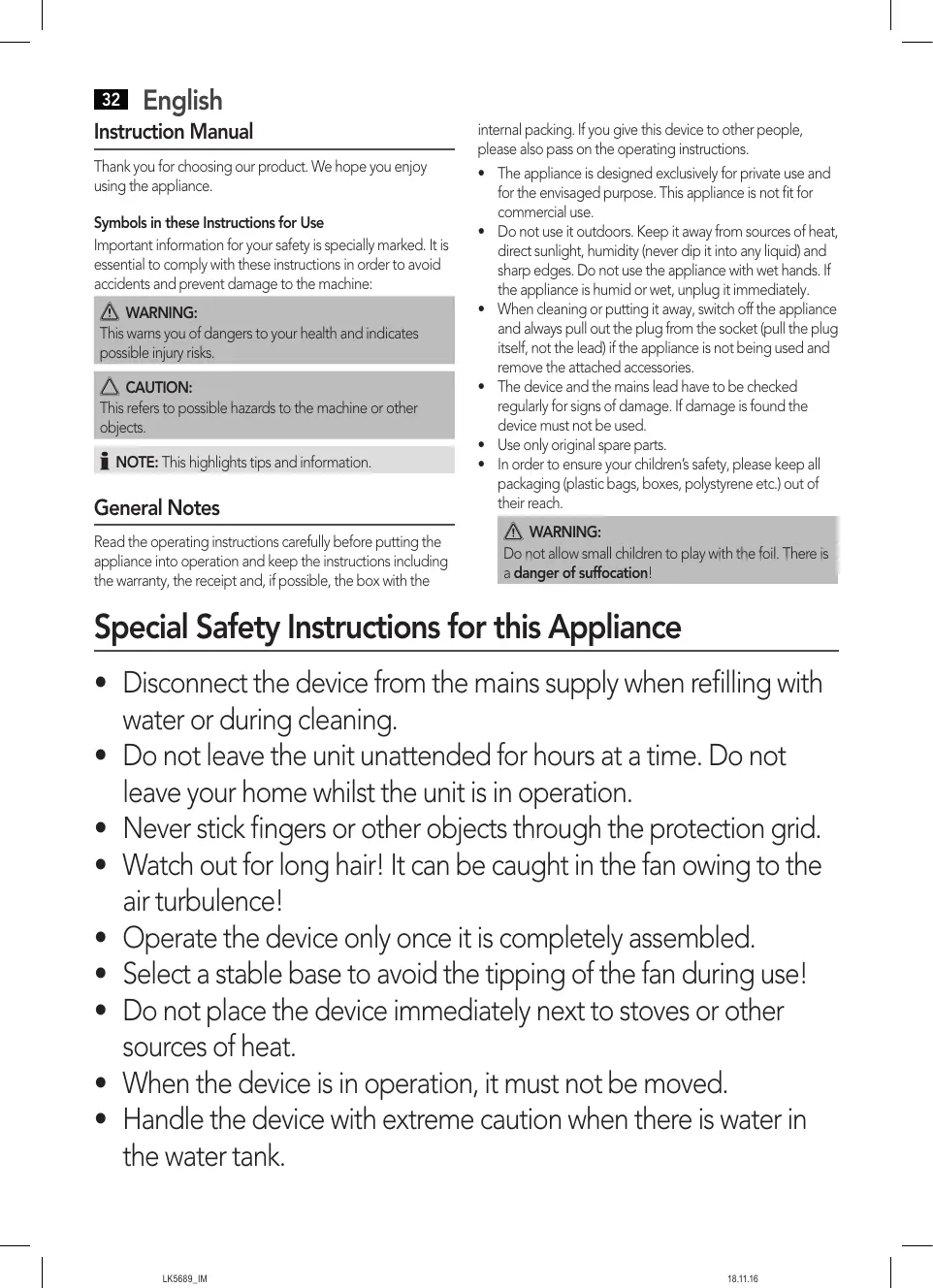 This appliance acts as a fan and/or air cooler, air humidifier. It is intended exclusively for this purpose and may only be used as such. It may only be used in the manner described in these instructions for use. The device must not be used for commercial purposes.