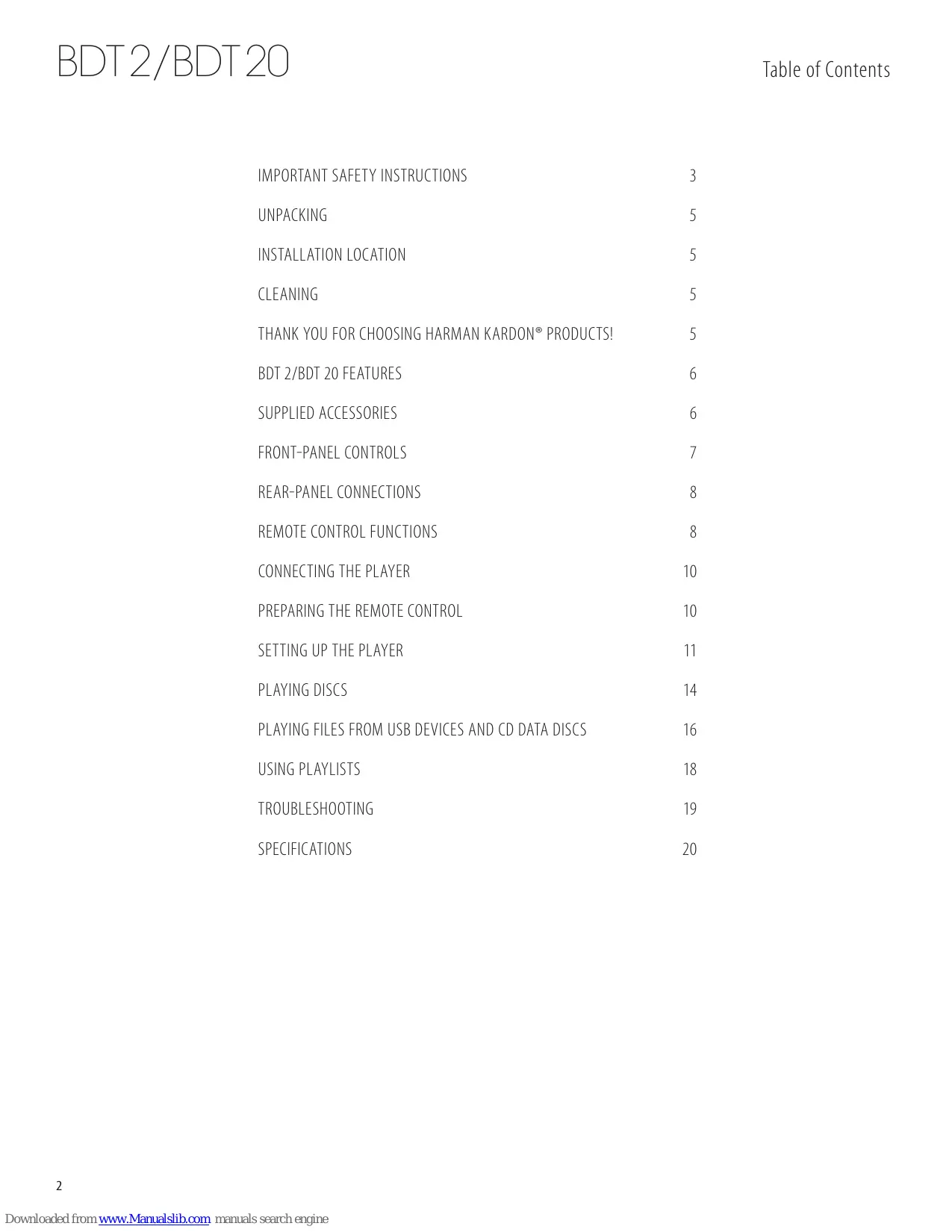 Incorporating the latest high-definition audio and video processing technologies, the BDT 2/BDT 20 is an essential part of a modern home theater system. It plays your favorite Blu-ray Disc movies with up to 1080/24p video resolution when available on the disc, thanks to HDMI™ (High-Definition Multimedia Interface) v.1.3a with 30/36-bit Deep Color connectivity. Connect the BDT 2/BDT 20 to the Internet, and BD-Live™ interactivity (available with compatible discs) delivers additional features, updates and news of live events. Even older DVD-Video discs will deliver outstanding picture quality when they are upscaled to 1080p video resolution. Yet with all of its sophistication, the BDT 2/BDT 20 is simple to operate. Its controls are similar to those for DVD players, and its enhanced on-screen menu system guides you every step of the way. Easy to use and delivering outstanding performance, the BDT 2/BDT 20 is sure to provide enjoyment for many years to come. If you have any questions about this product, its installation or its operation, please contact your retailer or custom installer, or visit the Harman Kardon Web site at www.harmankardon.com.