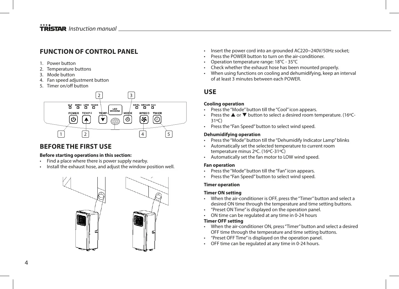 Insert the power cord into an grounded AC220~240V/50Hz socket; Press the POWER button to turn on the air-conditioner. Operation temperature range: 18°C - 35°C Check whether the exhaust hose has been mounted properly. When using functions on cooling and dehumidifying, keep an interval of at least 3 minutes between each POWER. USE