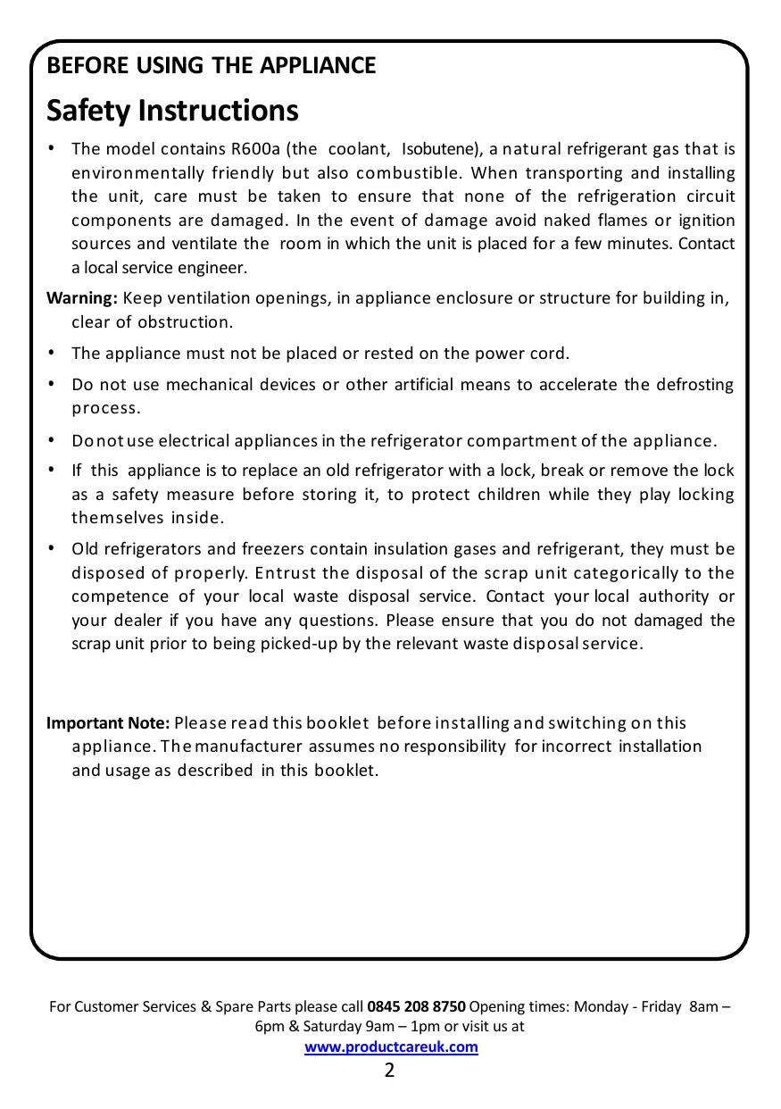 For Customer Services & Spare Parts please call 0845 208 8750 Opening times: Monday - Friday 8am – 6pm & Saturday 9am – 1pm or visit us at www.productcareuk.com
