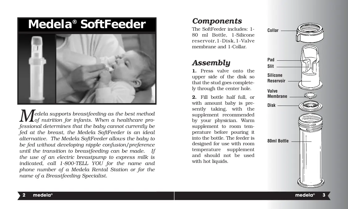 medela® Components The SoftFeeder includes: 180 ml Bottle, 1-Silicone reservoir,1-Disk,1-Valve membrane and 1-Collar. Collar Assembly Pad Slit