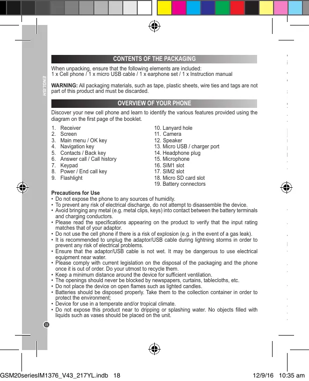 • Do not expose the phone to any sources of humidity. • To prevent any risk of electrical discharge, do not attempt to disassemble the device. • Avoid bringing any metal (e.g. metal clips, keys) into contact between the battery terminals and charging conductors. • Please read the specifications appearing on the product to verify that the input rating matches that of your adaptor. • Do not use the cell phone if there is a risk of explosion (e.g. in the event of a gas leak). • It is recommended to unplug the adaptor/USB cable during lightning storms in order to prevent any risk of electrical problems. • Ensure that the adaptor/USB cable is not wet. It may be dangerous to use electrical equipment near water. • Please comply with current legislation on the disposal of the packaging and the phone once it is out of order. Do your utmost to recycle them. • Keep a minimum distance around the device for sufficient ventilation. • The openings should never be blocked by newspapers, curtains, tablecloths, etc. • Do not place the device on open flames such as lighted candles. • Batteries should be disposed properly. Take them to the collection container in order to protect the environment; • Device for use in a temperate and/or tropical climate. • Do not expose this product near to dripping or splashing water. No objects filled with liquids such as vases should be placed on the unit. 18