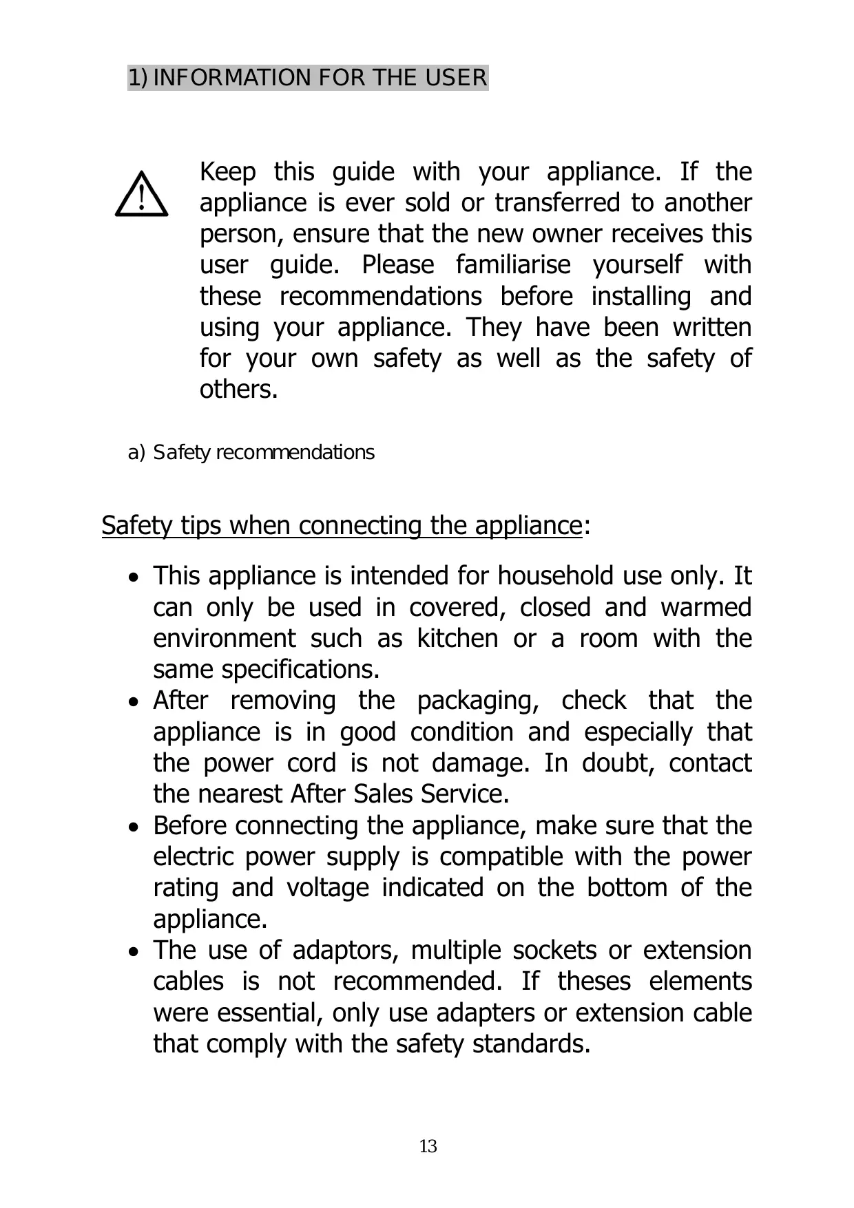 Keep this guide with your appliance. If the appliance is ever sold or transferred to another person, ensure that the new owner receives this user guide. Please familiarise yourself with these recommendations before installing and using your appliance. They have been written for your own safety as well as the safety of others.