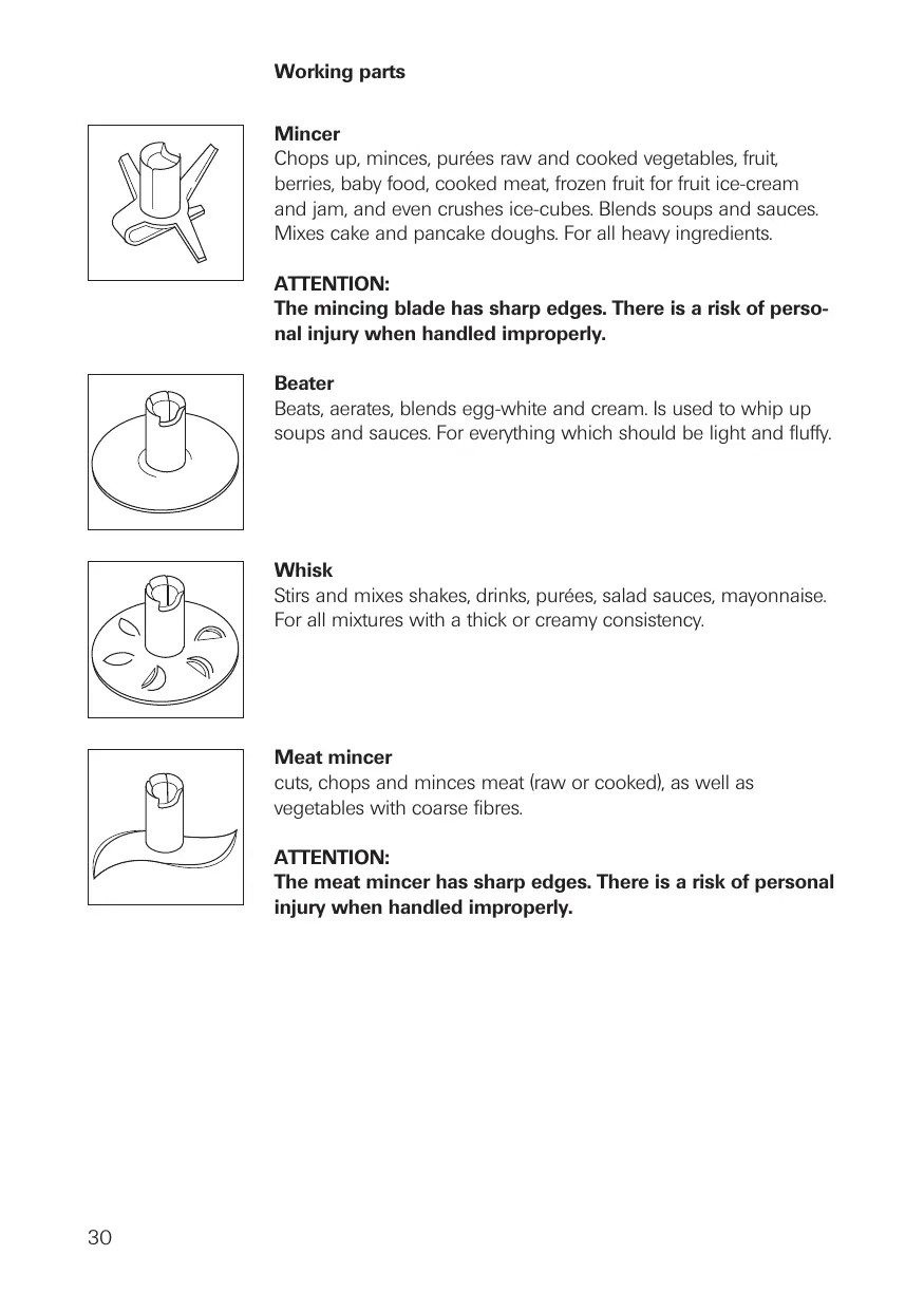 Working parts Mincer Chops up, minces, purées raw and cooked vegetables, fruit, berries, baby food, cooked meat, frozen fruit for fruit ice-cream and jam, and even crushes ice-cubes. Blends soups and sauces. Mixes cake and pancake doughs. For all heavy ingredients. ATTENTION: The mincing blade has sharp edges. There is a risk of personal injury when handled improperly. Beater Beats, aerates, blends egg-white and cream. Is used to whip up soups and sauces. For everything which should be light and fluffy. Whisk Stirs and mixes shakes, drinks, purées, salad sauces, mayonnaise. For all mixtures with a thick or creamy consistency. Meat mincer cuts, chops and minces meat (raw or cooked), as well as vegetables with coarse fibres. ATTENTION: The meat mincer has sharp edges. There is a risk of personal injury when handled improperly.