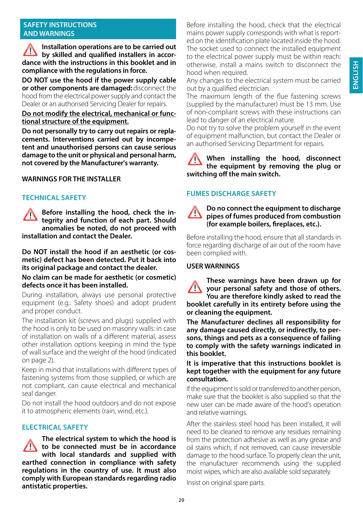 Installation operations are to be carried out by skilled and qualified installers in accordance with the instructions in this booklet and in compliance with the regulations in force. DO NOT use the hood if the power supply cable or other components are damaged: disconnect the hood from the electrical power supply and contact the Dealer or an authorised Servicing Dealer for repairs. Do not modify the electrical, mechanical or functional structure of the equipment. Do not personally try to carry out repairs or replacements. Interventions carried out by incompetent and unauthorised persons can cause serious damage to the unit or physical and personal harm, not covered by the Manufacturer's warranty. When installing the hood, disconnect the equipment by removing the plug or switching off the main switch. Do no connect the equipment to discharge pipes of fumes produced from combustion (for example boilers, fireplaces, etc.). Before installing the hood, check the integrity and function of each part. Should anomalies be noted, do not proceed with installation and contact the Dealer. Before installing the hood, ensure that all standards in force regarding discharge of air out of the room have been complied with. Do NOT install the hood if an aesthetic (or cosmetic) defect has been detected. Put it back into its original package and contact the dealer. No claim can be made for aesthetic (or cosmetic) defects once it has been installed. During installation, always use personal protective equipment (e.g.: Safety shoes) and adopt prudent and proper conduct. The installation kit (screws and plugs) supplied with the hood is only to be used on masonry walls: in case of installation on walls of a different material, assess other installation options keeping in mind the type of wall surface and the weight of the hood (indicated on page 2). Keep in mind that installations with different types of fastening systems from those supplied, or which are not compliant, can cause electrical and mechanical seal danger. Do not install the hood outdoors and do not expose it to atmospheric elements (rain, wind, etc.). USER WARNINGS These warnings have been drawn up for your personal safety and those of others. You are therefore kindly asked to read the booklet carefully in its entirety before using the or cleaning the equipment. The Manufacturer declines all responsibility for any damage caused directly, or indirectly, to persons, things and pets as a consequence of failing to comply with the safety warnings indicated in this booklet. It is imperative that this instructions booklet is kept together with the equipment for any future consultation. If the equipment is sold or transferred to another person, make sure that the booklet is also supplied so that the new user can be made aware of the hood's operation and relative warnings. After the stainless steel hood has been installed, it will need to be cleaned to remove any residues remaining from the protection adhesive as well as any grease and oil stains which, if not removed, can cause irreversible damage to the hood surface. To properly clean the unit, the manufacturer recommends using the supplied moist wipes, which are also available sold separately. ELECTRICAL SAFETY The electrical system to which the hood is to be connected must be in accordance with local standards and supplied with earthed connection in compliance with safety regulations in the country of use. It must also comply with European standards regarding radio antistatic properties. Insist on original spare parts.