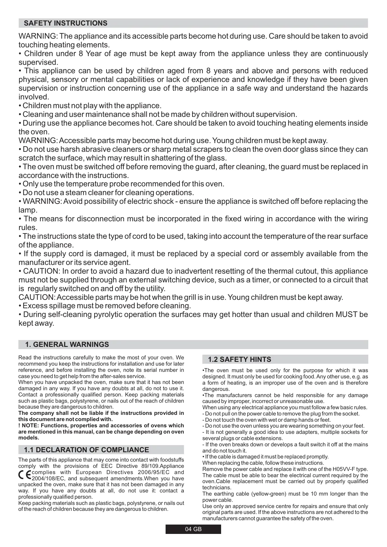 1.1 DECLARATION OF COMPLIANCE The parts of this appliance that may come into contact with foodstuffs comply with the provisions of EEC Directive 89/109.Appliance complies with European Directives 2006/95/EC and
