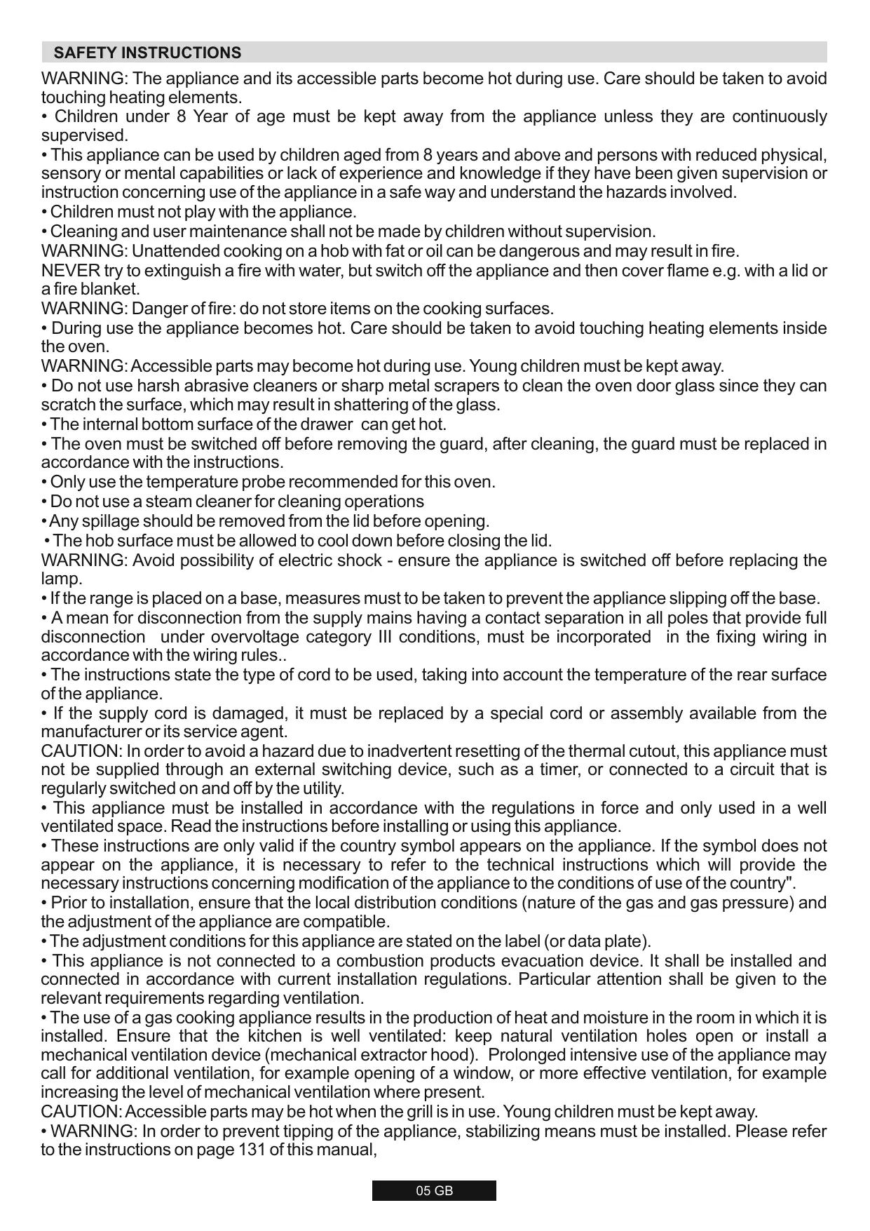 - WARNING: In order to prevent tipping of the appliance, stabilizing means must be installed. Please refer to the instructions on page 131 of this manual, 05 GB