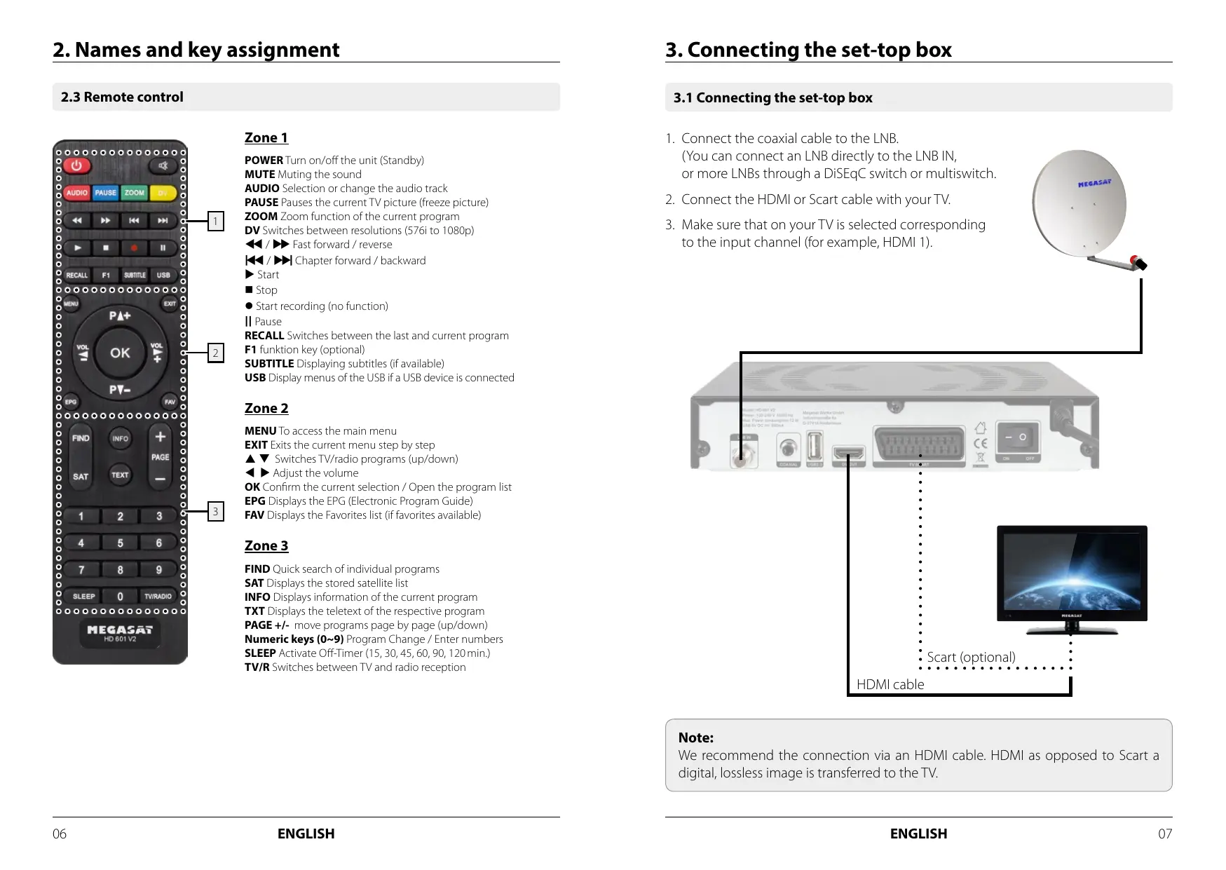 MENU To access the main menu EXIT Exits the current menu step by step p q Switches TV/radio programs (up/down) t u Adjust the volume OK Confirm the current selection / Open the program list EPG Displays the EPG (Electronic Program Guide) FAV Displays the Favorites list (if favorites available) Zone 3 FIND Quick search of individual programs SAT Displays the stored satellite list INFO Displays information of the current program TXT Displays the teletext of the respective program PAGE +/- move programs page by page (up/down) Numeric keys (0~9) Program Change / Enter numbers SLEEP Activate Off-Timer (15, 30, 45, 60, 90, 120 min.) TV/R Switches between TV and radio reception Scart (optional) HDMI cable Note: We recommend the connection via an HDMI cable. HDMI as opposed to Scart a digital, lossless image is transferred to the TV.