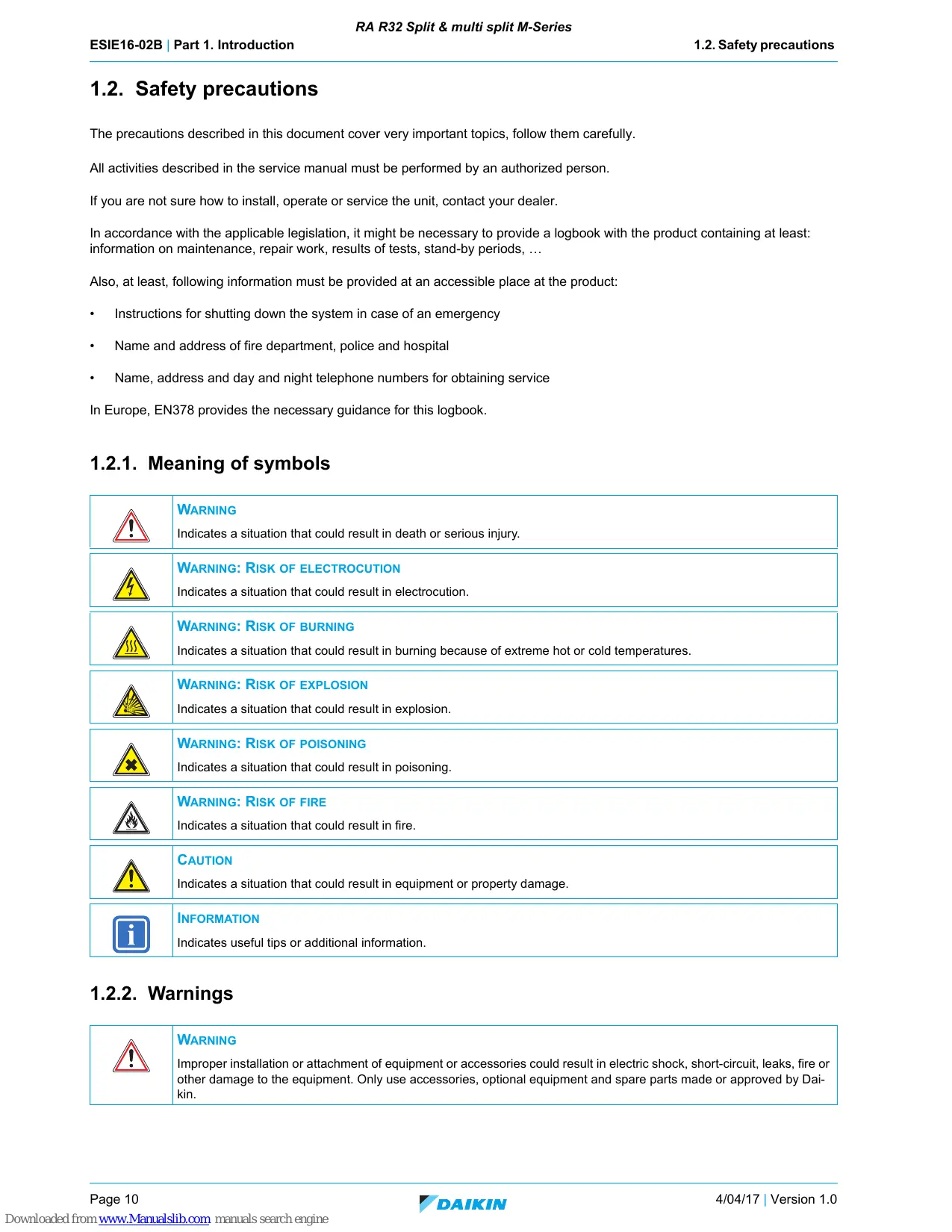 Manual also applicable for MXM-N 04/04/2017 4/04/17 | Version 1.0 Downloaded from www.Manualslib.com manuals search engine Page 9 RA R32 Split & multi split M-Series ESIE16-02B | Part 1. Introduction 1.2. Safety precautions 1.2. Safety precautions The precautions described in this document cover very important topics, follow them carefully. All activities described in the service manual must be performed by an authorized person. If you are not sure how to install, operate or service the unit, contact your dealer. In accordance with the applicable legislation, it might be necessary to provide a logbook with the product containing at least: information on maintenance, repair work, results of tests, stand-by periods, … Also, at least, following information must be provided at an accessible place at the product: