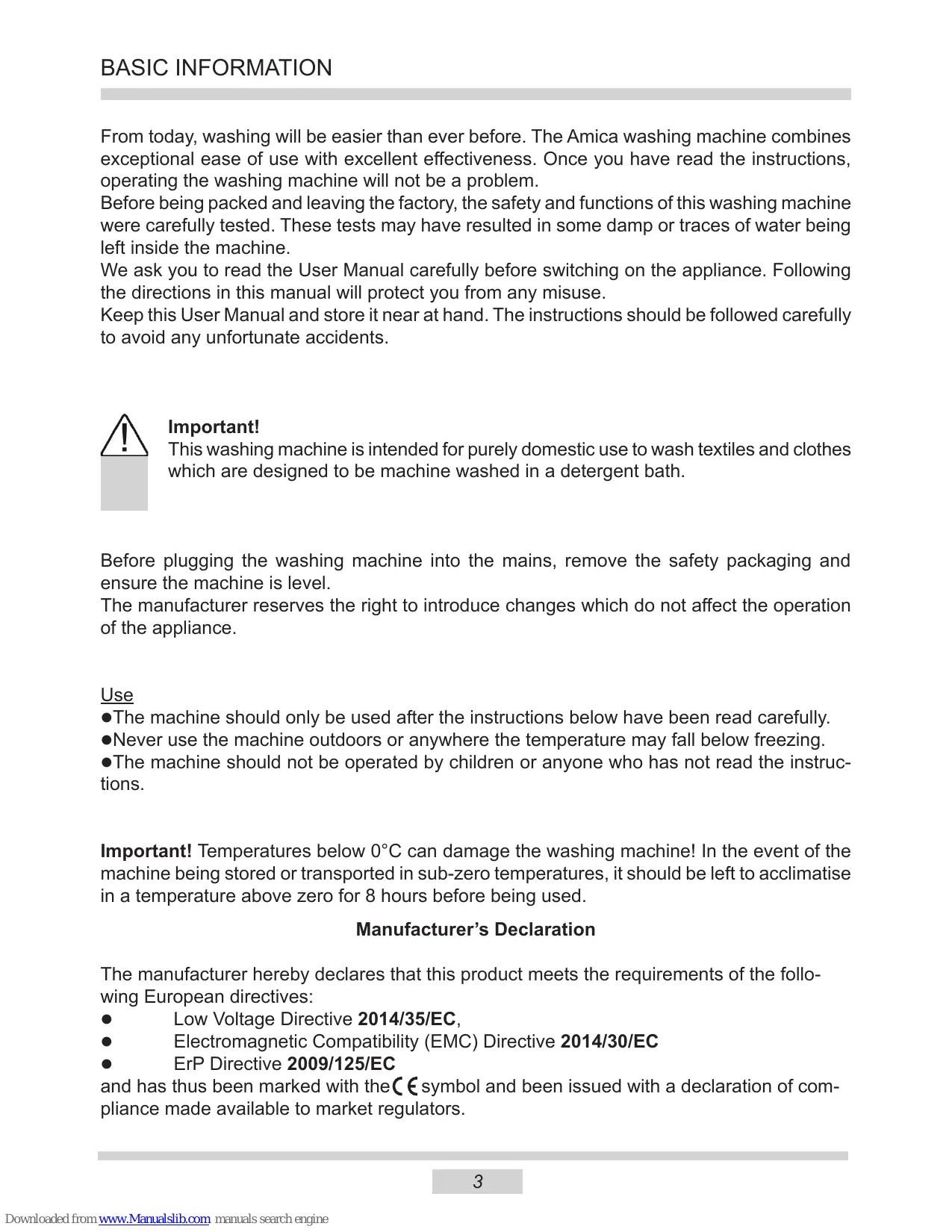 Downloaded from www.Manualslib.com manuals search engine BASIC INFORMATION From today, washing will be easier than ever before. The Amica washing machine combines exceptional ease of use with excellent effectiveness. Once you have read the instructions, operating the washing machine will not be a problem. Before being packed and leaving the factory, the safety and functions of this washing machine were carefully tested. These tests may have resulted in some damp or traces of water being left inside the machine. We ask you to read the User Manual carefully before switching on the appliance. Following the directions in this manual will protect you from any misuse. Keep this User Manual and store it near at hand. The instructions should be followed carefully to avoid any unfortunate accidents. Important! This washing machine is intended for purely domestic use to wash textiles and clothes which are designed to be machine washed in a detergent bath. Before plugging the washing machine into the mains, remove the safety packaging and ensure the machine is level. The manufacturer reserves the right to introduce changes which do not affect the operation of the appliance. Use lThe machine should only be used after the instructions below have been read carefully. lNever use the machine outdoors or anywhere the temperature may fall below freezing. lThe machine should not be operated by children or anyone who has not read the instructions. Important! Temperatures below 0°C can damage the washing machine! In the event of the machine being stored or transported in sub-zero temperatures, it should be left to acclimatise in a temperature above zero for 8 hours before being used. Manufacturer’s Declaration The manufacturer hereby declares that this product meets the requirements of the following European directives: Low Voltage Directive 2014/35/EC, Electromagnetic Compatibility (EMC) Directive 2014/30/EC ErP Directive 2009/125/EC and has thus been marked with the symbol and been issued with a declaration of compliance made available to market regulators.