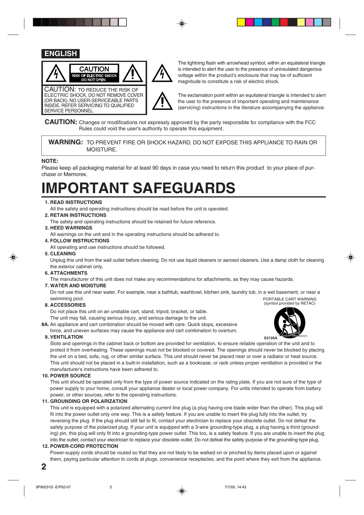 MOISTURE. NOTE: Please keep all packaging material for at least 90 days in case you need to return this product to your place of purchase or Memorex. IMPORTANT SAFEGUARDS