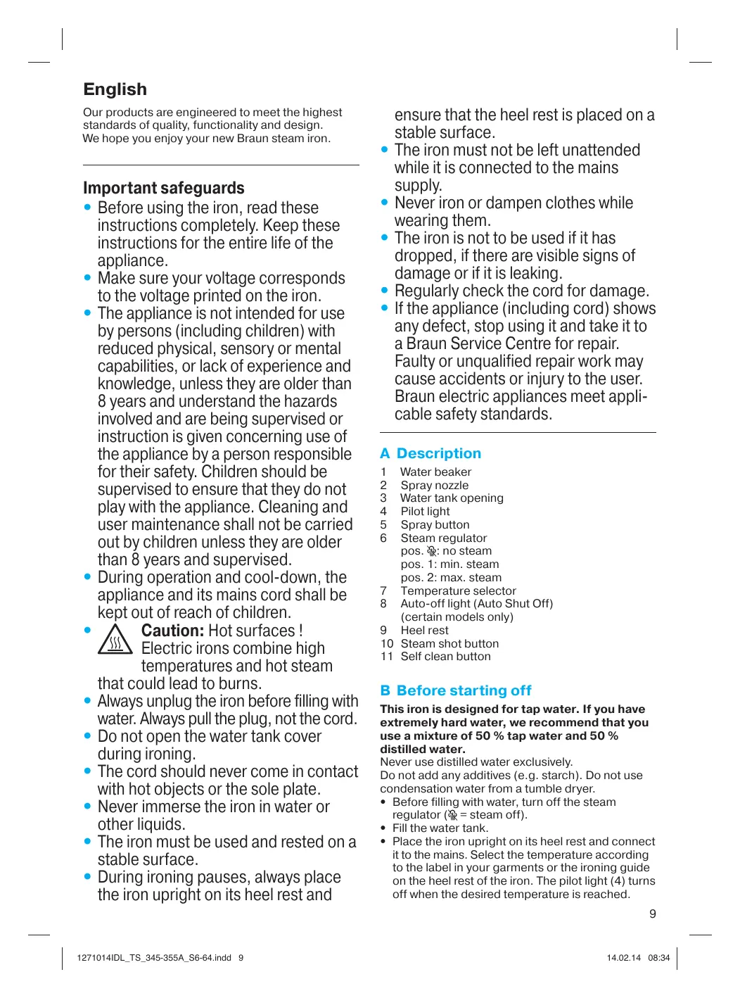 English Our products are engineered to meet the highest standards of quality, functionality and design. We hope you enjoy your new Braun steam iron. Important safeguards