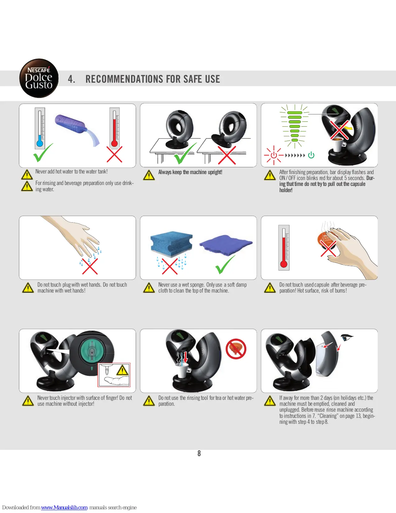 1. SAFETY PRECAUTIONS 1. Read all instructions and keep these safety instructions. Any type of misuse of the appliance may result in a potential injury. 2. Connect the appliance to a mains power socket with an earth connectiononly. Mains voltage must be the same as the details on the rating plate. The use of incorrect connection will negate the guarantee and may be hazardous. 3. This appliance is intended to be used in household only. It is not intended to be used in following applications, and the guarantee will not applyfor: – staff kitchen areas in shops, offices and other working environments; – farm houses; – by clients in hotels, motels and other residential type environments; – bed and breakfast type environments; 4. Your appliance is intended for domestic use inside the home only at an altitude below 3400 m. 5. In case of any inappropriate use or failure to comply with the instructions, the manufacturer accepts no responsibility and the guarantee may not apply. 6. We recommend using the NESCAFÉ® Dolce Gusto® capsules designed and tested for the NESCAFÉ® Dolce Gusto® machine. They were designed to interact together - the interaction provides the in-cup quality thatNESCAFÉ® Dolce Gusto® is known for. Each capsule is designed toprepare a perfect cup, and cannot be reused. 7. Do not remove hot capsules by hand. Always use capsule holder handle todispose of used capsules. 8. Always use the appliance on a flat, stable, heat resistant surface away from sources of heat or water splashes. 9. To protect against fire, electric shock and injury to persons do not immersethe power cord, plugs or the appliance in water or other liquid. Avoidspillage on the plug. Never touch the power cord with wet hands. Donot overfill the water tank. 10. In case of an emergency remove the plug from the mains power socket immediately. 11. Close supervision is necessary when the appliance is used near children. Keep the appliance / power cord / capsule holder out of reach of children. Children should be supervised to ensure that they do not play with the appliance. Never leave the appliance without surveillance whilemaking a beverage. 12. This appliance is not intended for use by children or persons with reducedphysical, sensory or mental capabilities, or lack of experience and knowledge, unless they have been given supervision or instruction concerninguse of the appliance by a person responsible for their safety. Personswho have a limited or no understanding of the operation and use of this appliance must first read and fully understand the contents ofthe user manual, and where appropriate seek additional guidance on its operation and use from the person responsible for their safety. 13. Do not use the appliance without the drip tray and drip grid, except