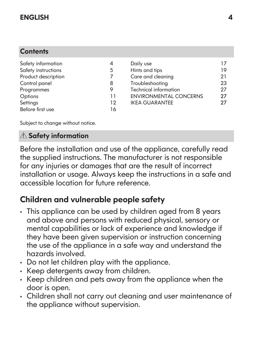 This appliance can be used by children aged from 8 years and above and persons with reduced physical, sensory or mental capabilities or lack of experience and knowledge if they have been given supervision or instruction concerning the use of the appliance in a safe way and understand the hazards involved. Do not let children play with the appliance. Keep detergents away from children. Keep children and pets away from the appliance when the door is open. Children shall not carry out cleaning and user maintenance of the appliance without supervision. ENGLISH